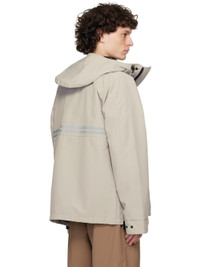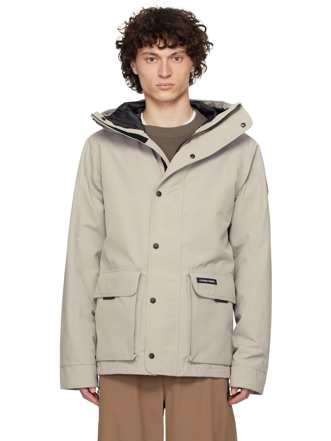 Polyester- and cotton-blend Arctic Tech® canvas jacket. · Water-repellent · Bungee-style drawstring at hood · Funnel neck · Two-way zip closure with press-stud placket · Flap and patch pockets · Adjustable press-stud tab at cuffs · Reflective trim at back · Zip and patch pocket at interior · Full satin lining Supplier color: Limestone Body: 84% polyester, 16% cotton. Lining: 100% polyester. Made in Canada 251014M180013