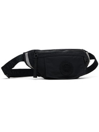 Technical canvas belt bag. · Adjustable crossbody strap · Flap pocket with embroidered logo patch at face · D-ring at side · Reflective stripe at sides · Zip pocket and logo-embroidered strap at back face · Zip closure at main compartment · Patch pocket at interior · Quilted satin lining · H7" x W13" x D3" Part of the Black Label collection. Supplier color: Black Nylon. Made in Canada 261014M171001
