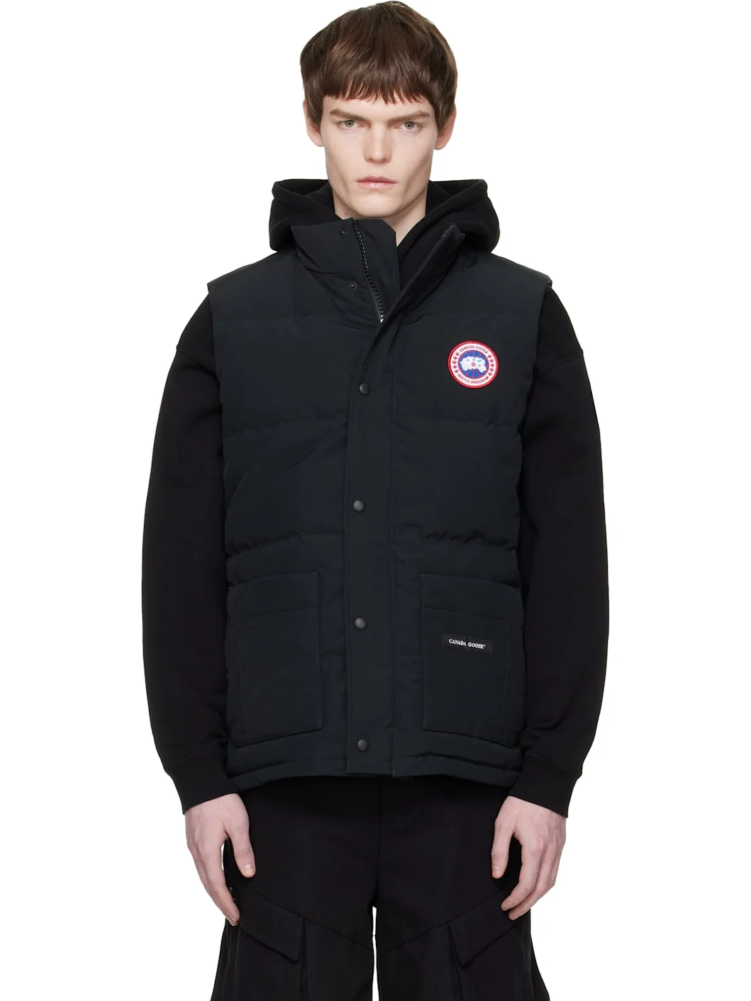 Down-filled and quilted taffeta vest. · Water-repellent · Funnel neck · Two-way zip closure · Embroidered logo patch at chest · Patch pockets and logo patch at front · Zip pocket at interior · Full satin lining Supplier color: Black Body: 84% polyester, 16% cotton. Fill: 80% duck down, 20% duck feather. Lining: 100% polyamide. Made in Canada 261014M185002
