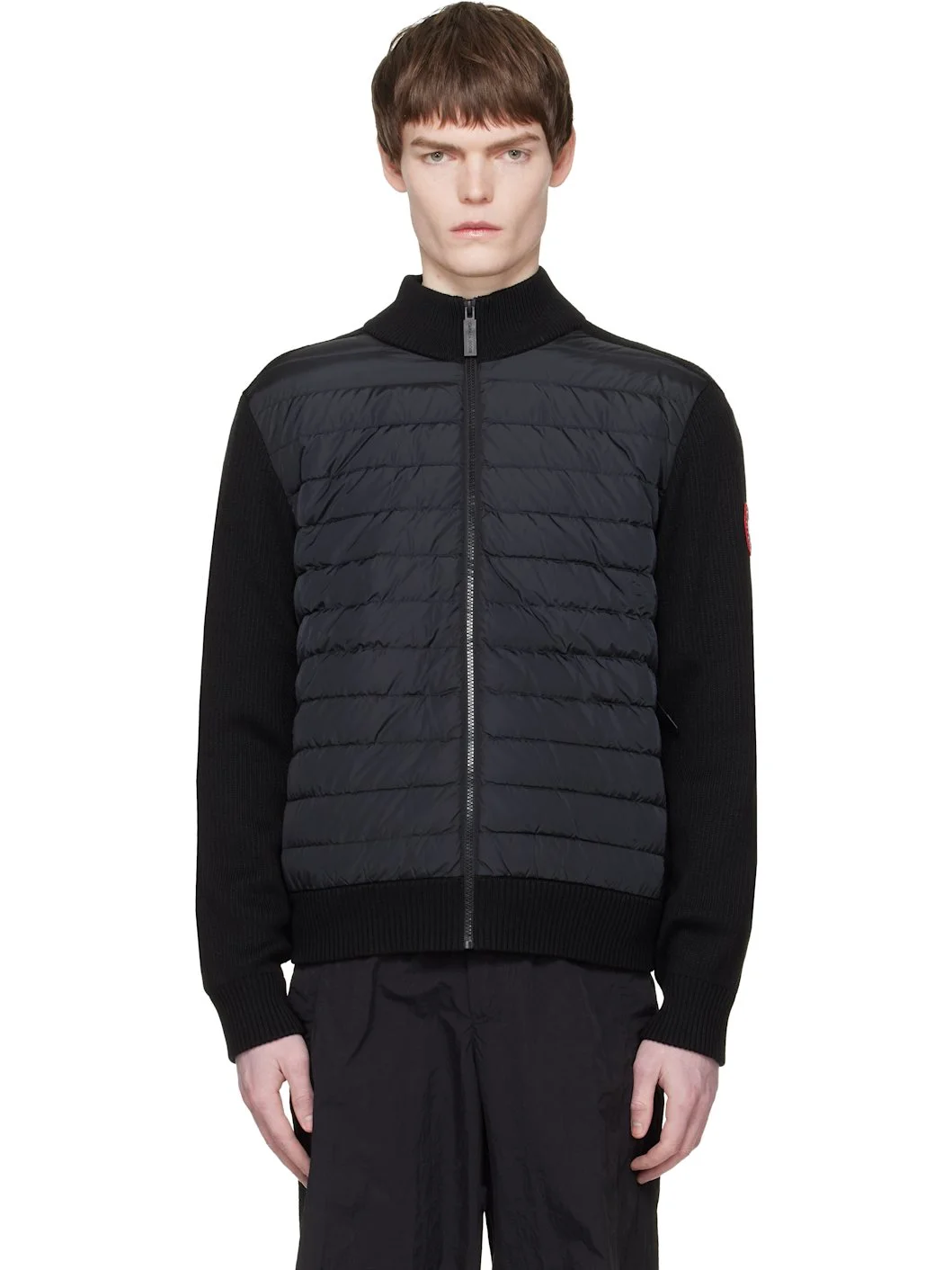 Down-filled quilted nylon satin and rib-knit wool jacket. · Water-repellent and wind-resistant · Stand collar · Two-way zip closure · Zip pockets at front · Embroidered logo patch at sleeve · Partially lined Supplier color: Black Body: 100% polyamide. Trim: 100% wool. Fill: 90% duck down, 10% duck feather. Lining: 100% polyamide. Made in Romania 261014M180001