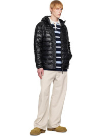 Packable down-filled and quilted stretch recycled nylon ripstop jacket. Stretch fleece panels throughout. · Packs into waist pocket · Lightweight, water-repellent, and wind-resistant · Elasticized trim at hood and cuffs · Stand collar · Two-way zip closure · Zip pockets · Raglan sleeves · Embroidered logo patch at sleeve · Reflective trim at back collar · Patch pockets at interior · Full nylon satin lining Supplier color: Black Fill: 90% goose down, 10% goose feather. Body 1: 100% polyamide. Body 2: 93% polyester, 7% elastane. Lining: 100% polyamide. Made in Canada 251014M178026