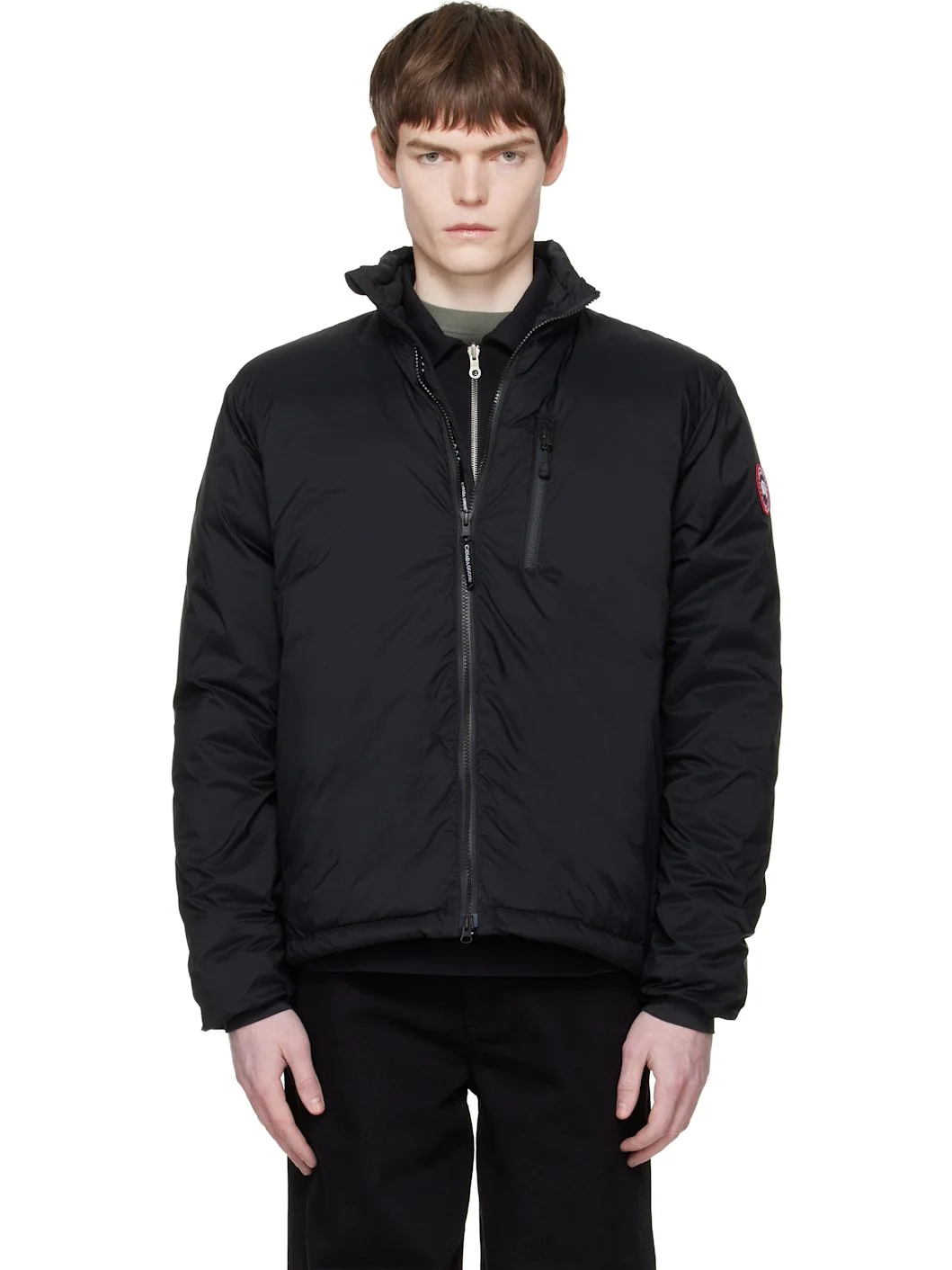 Down-filled nylon ripstop jacket. · Water-repellent, wind-resistant, and packable · Stand collar · Zip closure · Zip seam pockets · Bungee-style drawstring at hem · Embroidered logo patch at sleeve · Rib-knit cuffs · Zip pocket at interior · Fully lined Supplier color: Black Body: 100% polyamide. Fill: 90% duck down, 10% duck feather. Lining 1: 100% polyamide. Lining 2: 100% polyester. Made in Canada 261014M180005