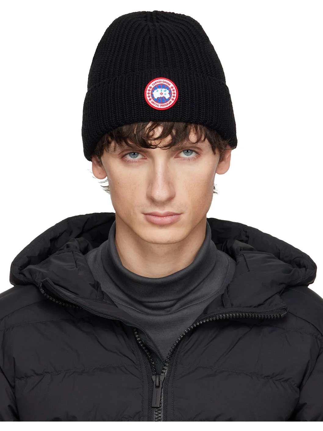 Rib-knit wool beanie. Embroidered logo patch at rolled brim. Supplier color: Black 100% wool. Made in Italy 252014M138011