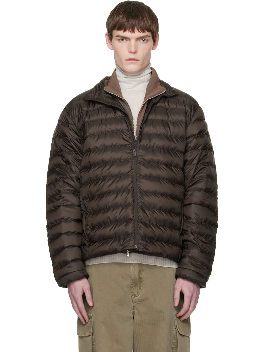 Down-filled and quilted ripstop jacket. · Water-repellent, wind-resistant, and packable · Stand collar · Zip closure · Zip pockets at front · Bungee-style drawstring at hem · Embroidered logo patch at sleeve · Elasticized cuffs · Patch and zip pocket at interior · Fully lined Part of the Tonal Label collection. Supplier color: Terra Body: 100% polyester. Lining: 100% polyester. Fill: 90% duck down, 10% duck feather. Made in Canada 261014M178006