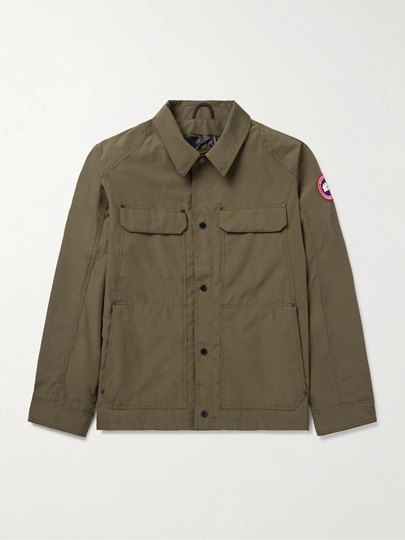 Canada Goose's 'Burnaby' chore jacket is inspired by traditional workwear. Designed for transitional weather, it's made from the label's durable, water-repellent 'Arctic Tech®' and has plenty of utility pockets, including a zipped one inside for your phone. Flip up the collar to reveal signature reflective trims. Size & Fit - Fits true to size. Take your normal size - Regular fit; designed for movement - Lightweight, non-stretchy fabric - Model is shown wearing a M - Model measures: chest 38"/ 96cm, height 6'1"/ 185cm Details & Care - Army-green Arctic Tech® - Snap fastenings - 84% polyester, 16% cotton; lining: 100% polyester - Machine wash