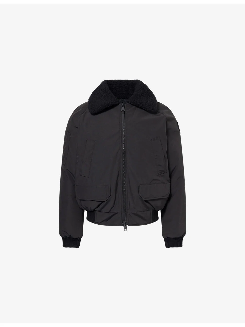 PRODUCT DETAILS - Canada Goose woven-down jacket - 84% polyester, 16% cotton; filling 90% down, 10% feathers; lining 100% polyamide; trims 52% wool, 40% polyester, 4% polyamide, 4% other fibres - Exposed two-way zip fastening at front - Relaxed fit, faux-fur wide collar, raglan long sleeves, zip pocket and brand patch at sleeve, two welt pockets at waist, two flap pockets at front, one zipped pocket at interior chest, all-over padding, fully lined, ribbed trims - Dry clean - Made in Canada - Size medium: length 26.5in / 67cm, chest 48in / 122cm - Model is 6ft 2in/1.88m and wears a size medium - Midweight, non-stretch Ref: R04534990