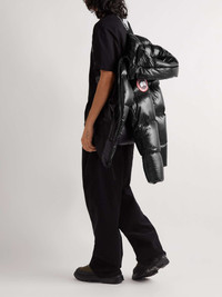 Whether you're hiking trails or setting out on an urban adventure, Canada Goose's signature 'Crofton' jacket is an excellent choice of outerwear. It's made from recycled-nylon ripstop that's padded with down for weightless warmth. The interior backpack straps mean you can wear it over your shoulders, or fold it away into the left pocket to create a small bag. Size & Fit - Fits true to size. Take your normal size - The model is wearing a size larger to achieve a relaxed fit - This jacket is intended for a relaxed fit with a thick lining for a close internal fit - Quilted, non-stretchy fabric - Model wears a M - Model measures: chest 36"/ 92cm, height 6'1"/ 185cm Details & Care - Black recycled-nylon ripstop - Two-way zip fastening - 100% recycled nylon; filling: 90% down, 10% feathers (Duck) - Machine wash