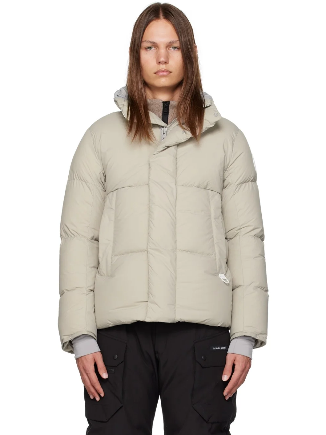 Down-filled quilted lightweight EnduraLuxe nylon taffeta jacket. Wind- and water-resistant. · Funnel neck · Two-way zip closure with press-stud placket · D-ring at front · Zip pockets · Bungee-style drawstring at hem · Rubberized logo patch at sleeve · Inset rib knit cuffs · Patch pockets and shoulder straps at interior · Fully lined Part of the Pastels collection. Supplier color: Limestone Fill: 90% duck down, 10% duck feathers. Body: 100% nylon. Lining: 100% nylon. Made in Canada 232014M178075