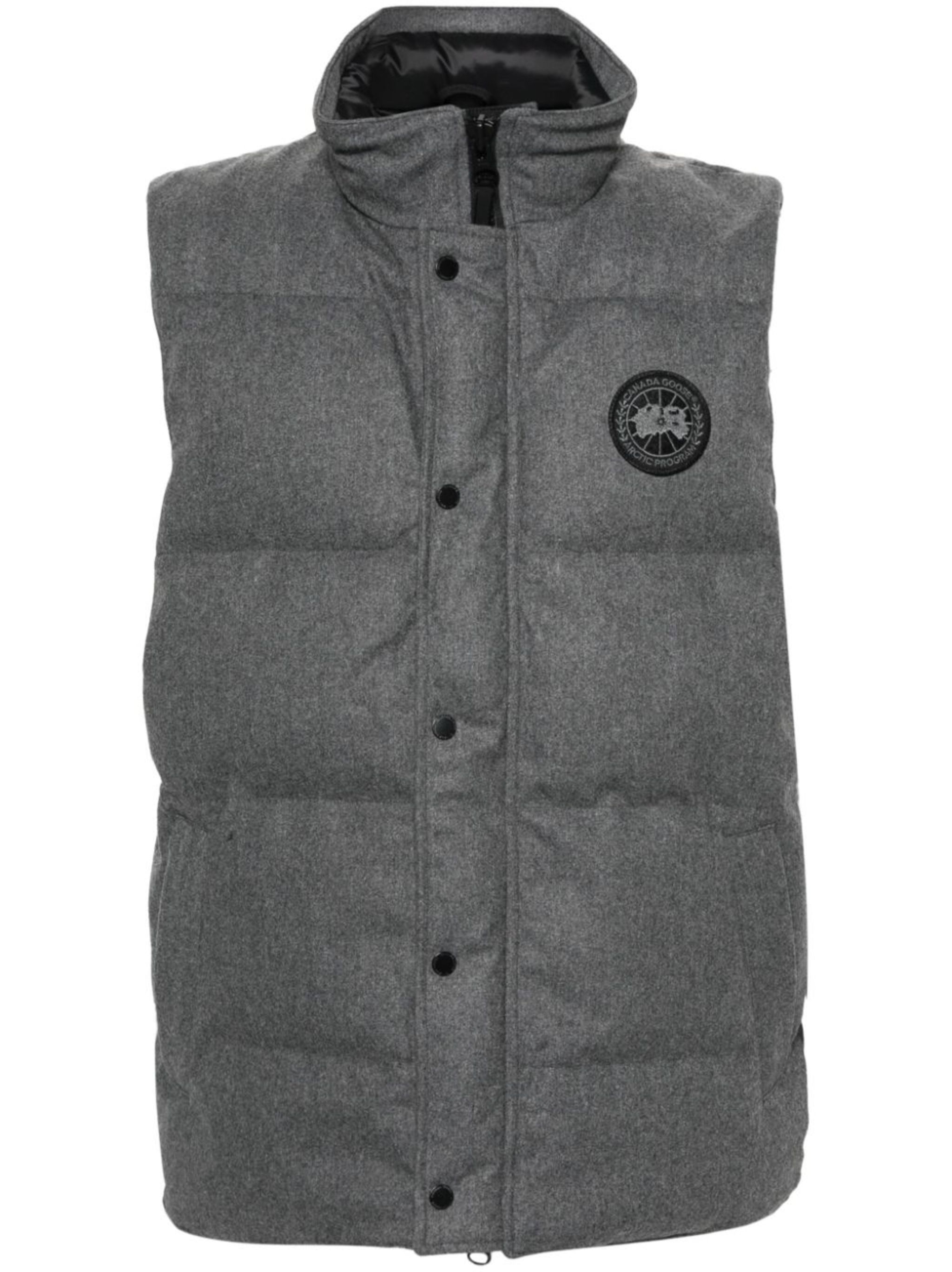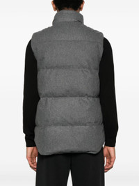 grey recycled wool blend duck feather down padded design quilted felted finish melange effect high neck sleeveless applique logo two zip-fastening pockets internal patch pockets internal zip-fastening pocket authenticity QR code full lining high-low hem front press-stud and zip fastening This item is made from at least 50% recycled or upcycled materials. For recycled synthetic clothing products, we highly recommend using a microfibre-catching washing bag to ensure that no microplastics that can pollute water are released in the process. Learn more about what makes a product Conscious on our Conscious Criteria page Size & Fit Model Measurements: Height: 1.87 m Bust/Chest: 94.0 cm Hips: 86.0 cm Waist: 71.0 cm Model wears size L Fabric and Care Designer Style ID: 4151M1 Designer Colour: 1551 GREYMELANGE Composition: Outer: Recycled wool 67%, Other fibers 2%, Polyamide 31%; Lining: Duck down 80%, Polyester 100%; Duck feathers 100% Washing instructions: Dry Clean Only Made in Canada