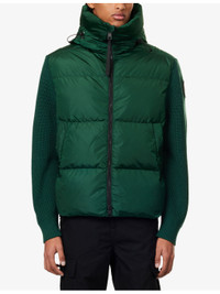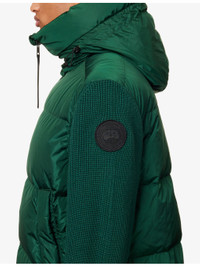 PRODUCT DETAILS - Canada Goose shell-down jacket - 100% polyamide; contrast 100% wool; filling 90% duck down, 10% duck feather; lining 100% polyamide - Exposed zip fastening at front - Regular fit, high-neck, drawstring hood, knitted long sleeves, two zip pockets at front, all-over quilted and padded, fully lined - Dry clean - Made in Romania - Size medium: length 25in / 64cm, chest 46in / 117cm - Model is 6ft 2in/1.88m and wears a size medium - Midweight, slight stretch Ref: R04572030