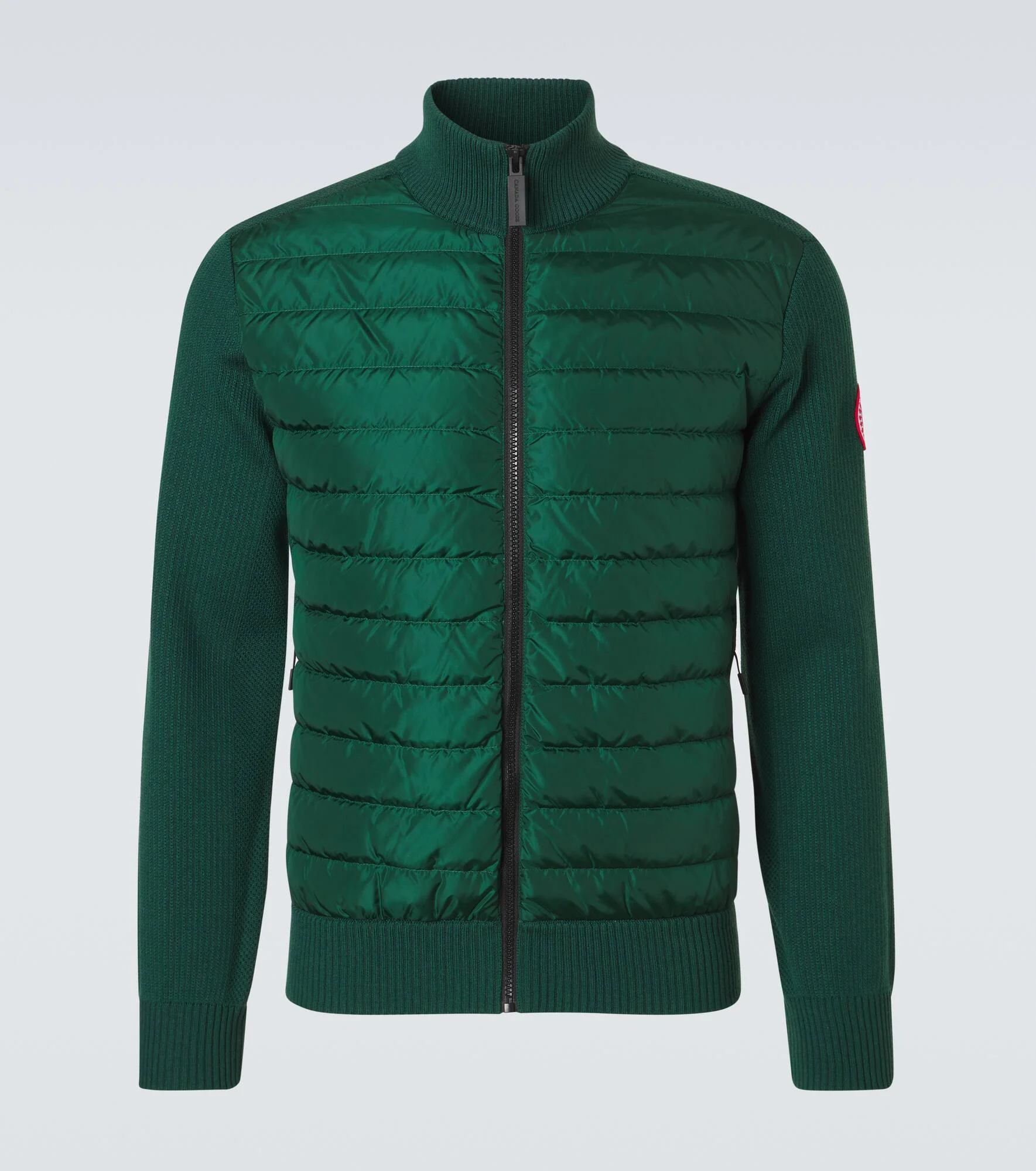 The HyBridge jacket from Canada Goose is crafted from a technical shell, the body of which is filled with goose down for enhanced insulation. The sleeves and back are knitted from soft wool from merino sheep. Product Details - Material: 100% wool - Care instructions: dry clean - Made in Romania - Color: green - Designer color name: Glade - Material II: 100% polyamide - Lining: 100% polyamide - Filling: 90% down, 10% feathers - Contains non-textile parts of animal origin - Closure: zipped front - Cuff: ribbed - Hem: ribbed - Item number: P01159070 Size & Fit - True to size - For a looser fit, we recommend taking one size up - Slim fit - Partly stretchy fabric - Falls to the hip - Height of model is 187cm-73.5" and wears a size M
