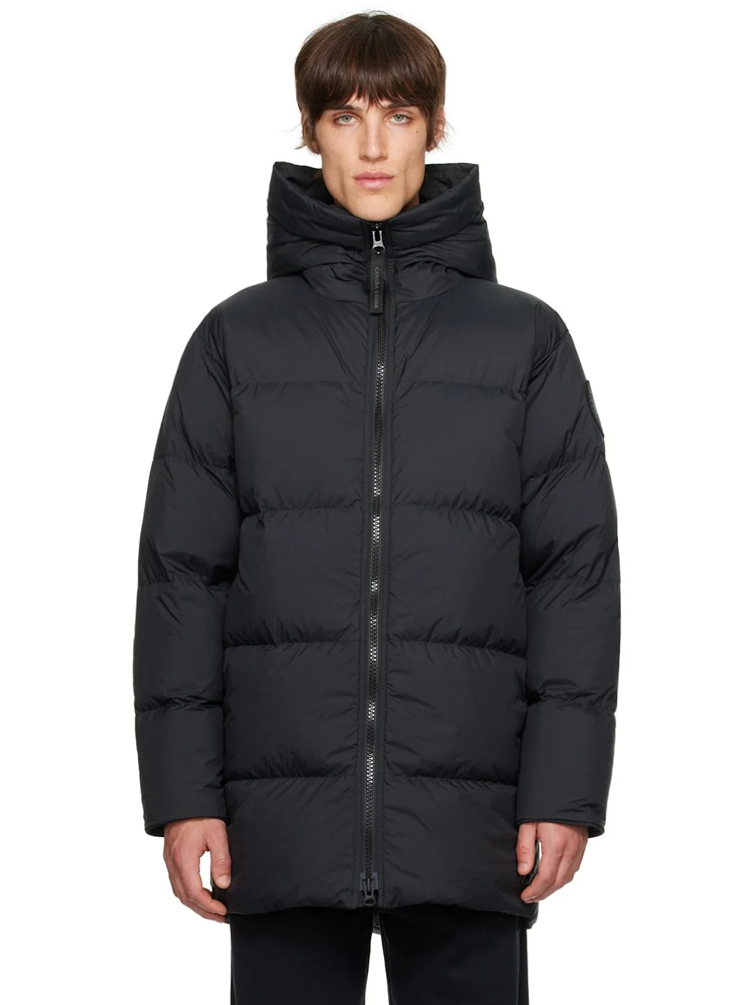 Down-filled and quilted EnduraLuxe nylon taffeta jacket. Lightweight, water-repellent, and durable. · Funnel neck · Two-way zip closure · Seam pockets · Logo patch at sleeve · Inset rib knit cuffs · CORDURA® piping at cuffs · Reflective webbing strap at back · Mesh patch pockets at interior · Logo-woven webbing shoulder straps at interior · Full satin lining Part of the Black Label collection. Supplier color: Black/Noir Fill: 90% duck down, 10% duck feathers. Body: 100% polyamide. Lining: 100% polyester. Made in Canada 242014M178045