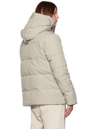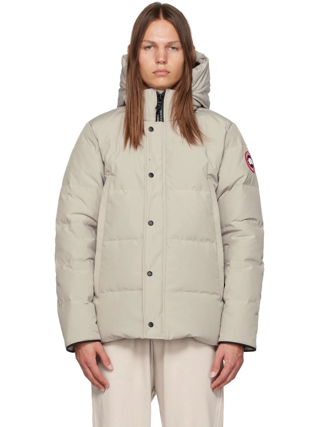 Down-filled quilted polyester-blend Arctic Tech® canvas jacket. Water-repellent. · Bungee-style drawstring at detachable hood · Stand collar · Two-way zip closure with press-stud placket · Zip pockets · Embroidered logo patch at sleeve · Inset rib knit cuffs · Patch pockets and zip pocket at interior · Shoulder straps at interior · Full nylon satin lining Supplier color: Limestone Fill: 80% duck down, 20% duck feathers. Body: 84% polyester, 16% cotton. Lining: 100% nylon. Made in Canada 232014M178052