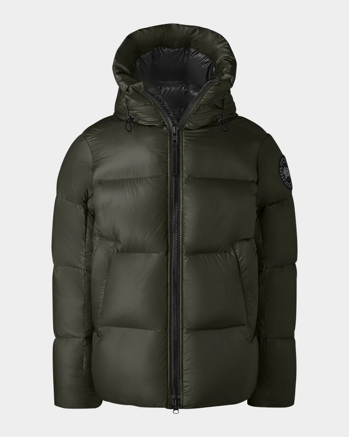 - Canada Goose "Crofton" shiny puffer coat with black disc logo on left sleeve - TEI 4 is optimal for temperatures 5°F to -15°F; it is inspired by the Arctic and made for enduring daily warmth. - Features backpack straps for hands-free carrying - Drawcord hood - Long sleeves - Two-way zip front - Side slip pockets - Recycled nylon - Fill: Feather/down - Made in Canada - The Thermal Experience Index (TEI) is an easy-to-understand five point system that enables you to make an informed choice in your search to find the right parka, jacket, or knitwear for your specific environment and activity. It works using a scale, in which 1 indicates the lightest insulation--jackets, lightweight down for active pursuits--and 5 indicates the warmest parkas we make, the kind trusted in the world’s harshest conditions.