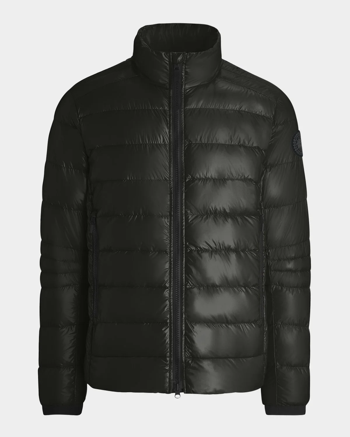 - Canada Goose "Crofton" shiny quilted jacket. - TEI 1 is optimal for temperatures 40°F to 25°F; It is lightweight and adaptable for active pursuits - Stand collar; two-way zip front. - Side zip pockets. - Logo patch at left arm. - Recycled nylon shell and lining. - 90/10 hutterite white duck down/feather fill. - Made in Canada. - The Thermal Experience Index (TEI) is an easy-to-understand five point system that enables you to make an informed choice in your search to find the right parka, jacket, or knitwear for your specific environment and activity. It works using a scale, in which 1 indicates the lightest insulation--jackets, lightweight down for active pursuits--and 5 indicates the warmest parkas we make, the kind trusted in the world’s harshest conditions.