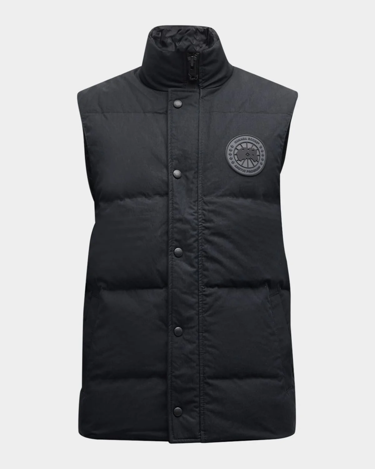 - Canada Goose "Garson" vest crafted in a crinkle cotton blend - TEI 1 is optimal for temperatures 40°F to 25°F; It is lightweight and adaptable for active pursuits - Stand collar - Zip/snap placket - Disc logo patch at chest - Welt pockets - Sleeveless - Protective, hi-low hem - Wind-resistant - Cotton/nylon - Fill: Down - Dry clean, machine wash cold, tumble dry, wash inside out - Made in Canada - The Thermal Experience Index (TEI) is an easy-to-understand five point system that enables you to make an informed choice in your search to find the right parka, jacket, or knitwear for your specific environment and activity. It works using a scale, in which 1 indicates the lightest insulation--jackets, lightweight down for active pursuits--and 5 indicates the warmest parkas we make, the kind trusted in the world’s harshest conditions.