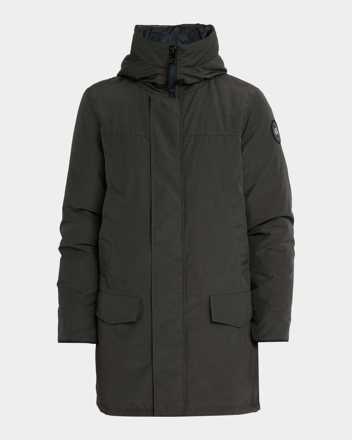 Canada Goose "Langford" parka TEI 4 is optimal for temperatures 5°F to 15°F; it is inspired by the Arctic and made for enduring daily warmth. Twoway adjustable hood Chin guard with tricot fabric for softness and comfort Twoway zip closure with storm flap Two fleecelined hand warmer pockets Two flap pockets Two interior pockets Slim fit Interior drawcord at waist Tonal disc logo patch at sleeve Recessed ribknit cuffs lock in heat Polyester/cotton Lining: Recycled nylon Fill: 80/20 duck down/duck feather Dry clean only Made in Canada