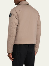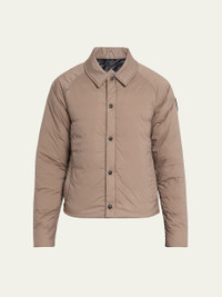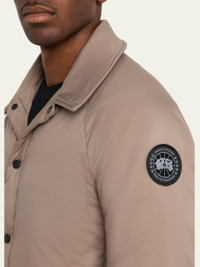 Canada Goose "Lodge" coach jacket in lightweight ripstop TEI 2 is optimal for temperatures 30°F to 5°F;. It is versatile and ideal for core warmth comfort Point collar Snap front closure Two exterior zippered pockets Two interior pockets: one dropin pocket, one zippered security pocket Packable into interior zip pocket Duck down fill Nylon/polyamide Machine wash cold, tumble dry Made in Canada