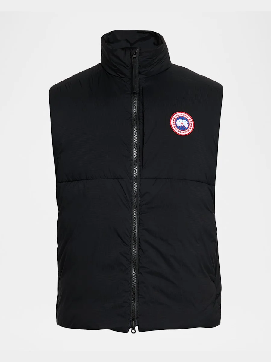 Crafted in featherlight ripstop with a waterrepellent and windresistant finish, the "Lodge" vest by Canada Goose is insulated with premium down and fully packable into the chest pocket. Stand collar Sleeveless Signature embroidered logo patch on the chest Side zip pockets Drawcord hem Twoway zipfront Amni® nylon Fill: Down/feather Machine wash cold Made in Canada