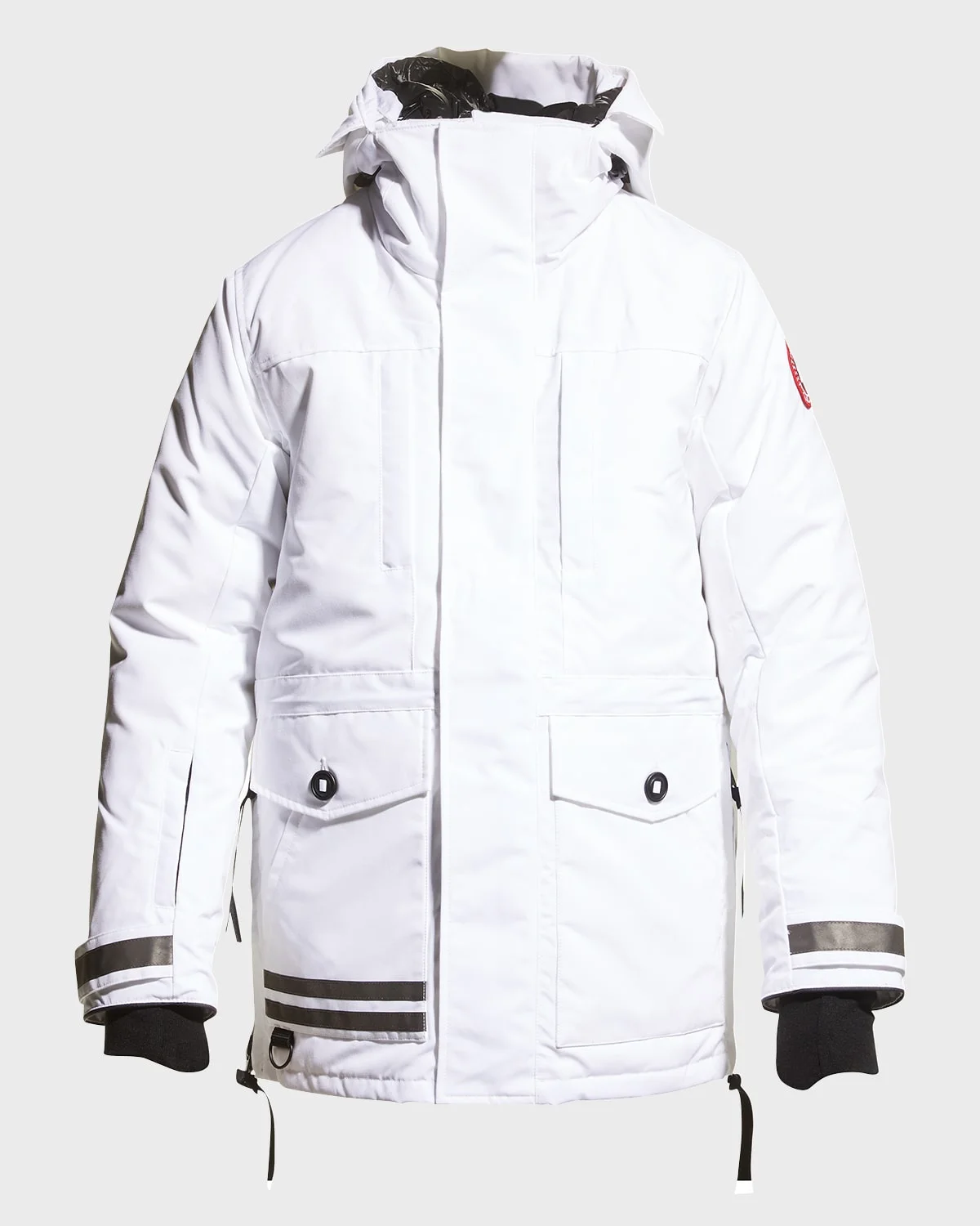 - Canada Goose "Toronto" jacket with reflective detailing. - Two-way adjustable hood. - Hidden zip/snap-button placket. - Four-pocket front. - Logo patch at left arm. - Banded cuffs with thumbholes. - Interior drawcord at waist. - Side seam zippers for ventilation and added range of motion. - Polyester/cotton/nylon. - 625 fill power white duck down. - Made in Canada. - Model is 6'1"/185cm.
