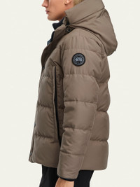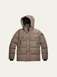 Canada Goose "Wyndham" solid parka with slim silhouette designed to keep you warm in variable conditions TEI 3 is optimal for temperatures 15°F to 5°F; it is fundamental warmth fashioned for everyday use. Removable downfilled hood with shaping wire Tricotlined chin guard for softness and comfort Zip front closure with snap placket Fleecelined hand warmer pockets Two interior pockets Tonal disc logo at sleeve Recessed ribknit cuffs lock in heat Polyester/cotton Lining: Recycled nylon Fill: Down Made in Canada