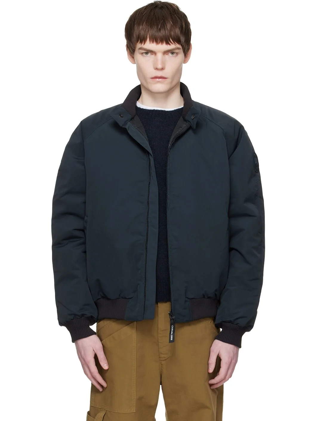 Down-filled cotton- and nylon-blend taffeta bomber jacket. · Water-repellent · Stand collar · Zip closure · Welt pockets at front · Rib-knit hem and cuffs · Raglan sleeves · Zip and patch pocket at interior · Full quilted satin lining Supplier color: Nocturne Body: 51% cotton, 49% polyamide. Fill: 90% duck down, 10% duck feather. Lining: 100% polyamide. Made in Canada 261014M175001