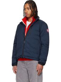 Packable down-filled nylon ripstop jacket. Lightweight, water-repellent, and wind-resistant. · Bungee-style drawstring at stand collar · Two-way zip closure · Zip pockets at front · Concealed bungee-style drawstring at hem · Embroidered logo patch at sleeve · Power Stretch® jersey cuffs · Zip pocket and patch pocket at interior · Fully lined Supplier color: Atlantic navy Body: 100% polyamide. Fill: 90% duck down, 10% duck feathers. Lining 1: 100% polyester. Lining 2: 100% polyamide. Made in Canada 252014M178022