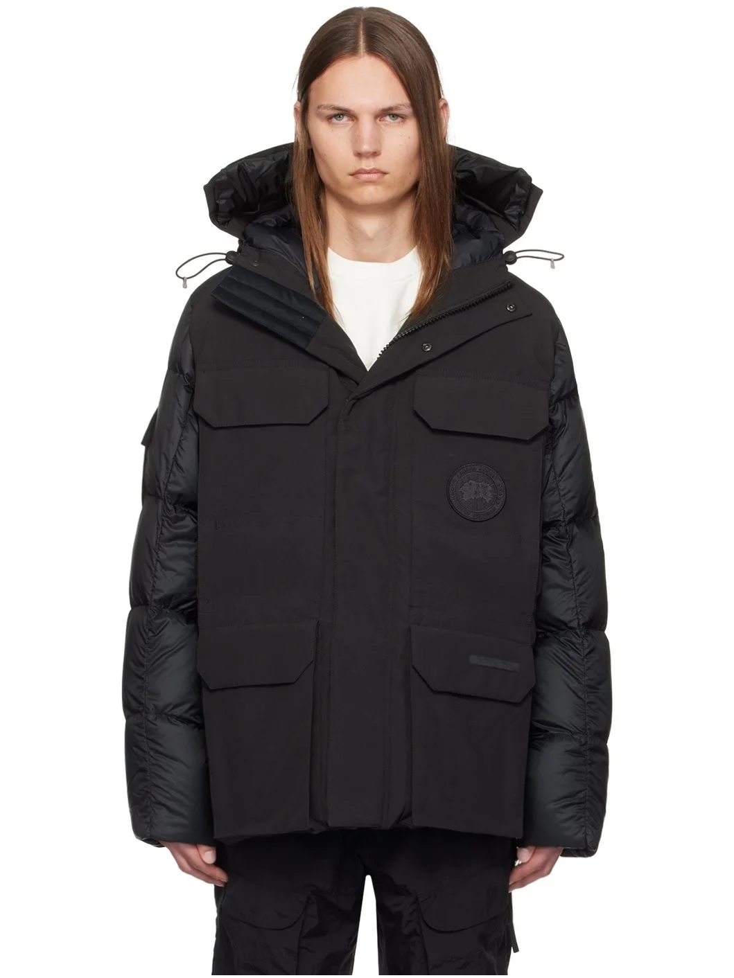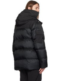 Down-filled and quilted nylon ripstop and Arctic Tech® polyester-blend canvas coat. Water-repellent, wind-resistant, and durable. · Bungee-style drawstring and detachable brim at hood · Stand collar · Two-way zip closure with press-stud placket · Flap and zip pockets · Logo patches at front · Concealed drawstring at waist · Zip vent at side seams · Utility pocket at sleeve · Pen slots at sleeve · Inset rib knit cuffs · Webbing strap with logo patch at back collar · Patch and zip pockets at interior · Shoulder straps at interior · Full nylon satin lining Part of the Paradigm collection, within the Black Label collection. Supplier color: Black Fill: 90% duck down, 10% duck feather. Body 1: 100% polyamide. Body 2: 84% polyester, 16% cotton. Lining: 100% polyamide. Made in Canada 242014M178008