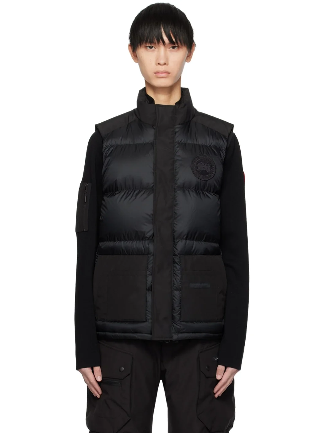 Down-filled quilted Recycled Feather-Light nylon ripstop and Recycled Organic Arctic Tech® polyester-blend taffeta vest. Lightweight, water-repellent, and wind-resistant. · Stand collar · Two-way zip closure with press-stud placket · Embroidered logo patch at chest · Patch pockets · Logo patch and webbing strap at back · Welt pockets at interior · Full nylon taffeta lining Part of the Paradigm collection, within the Black Label collection. Supplier color: Black Fill: 90% duck down, 10% feathers. Body 1: 100% polyamide. Body 2: 84% polyester, 16% cotton. Lining: 100% polyamide. Made in Canada 232014M178006
