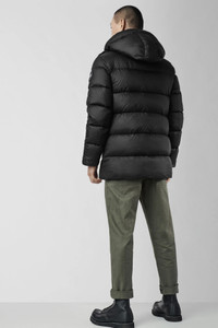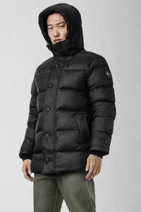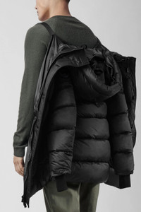 The Vernon Parka provides enduring warmth for frigid conditions. Its length and lightweight design allow you to comfortably wear it over a suit during cold weather commutes to the office. Extended sleeves with recessed rib-knit cuffs keep drafts out and military-inspired buttons add unique detailing. FEATURES - 2-way adjustable down-filled hood with shaping wire adds warmth and element protection - Chin guard is lined with Tricot fabric for softness and comfort - Interior backpack straps allow jacket to be carried hands-free over the shoulders - Recessed rib-knit cuffs add comfort and lock in heat - Placket with military button closures over 2-way zipper keeps the elements out. Unzip from the bottom for added range of motion and venting - 2 exterior pockets: fleece-lined handwarmer pockets - 1 interior pocket: security pocket with zipper closure - Black tonal Canada Goose Disc logo