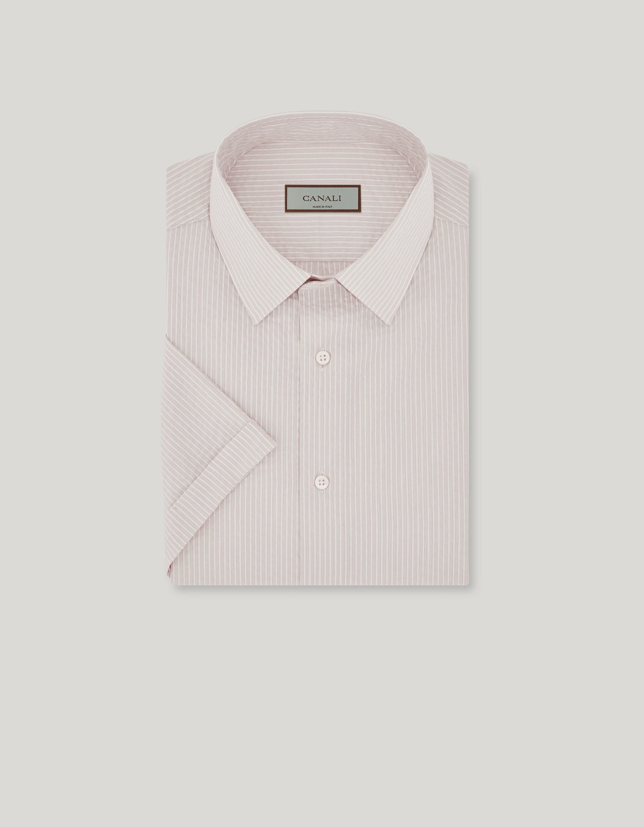 Seersucker cotton slim-fit formal shirt with narrow pointed collar and half sleeve for casual summer elegance. The lightweight, naturally cool texture of the fabric ensures breathability and comfort, while the quality craftsmanship ensures an impeccable fit for the man who wants a polished look even on the hottest days. FABRICS AND CRAFTSMANSHIP - Formal shirt - Narrow pointed collar - Collar height 3.8 cm - Removable ribs - Back darts - Smooth front with no placket - Half sleeve - 100% Cotton - Made in Italy CARE Machine wash max 30° - delicate cycle Do not bleach Do not iron Gentle dry clean with perchlorethylene Do not tumble dry FIT Slim fit The model is wearing a size 50 The model measures: Height: 185 cm (72.8 in) Chest: 100 cm (39.4 in) Waist: 79 cm (31.1 in) Hips: 95 cm (37.4 in)