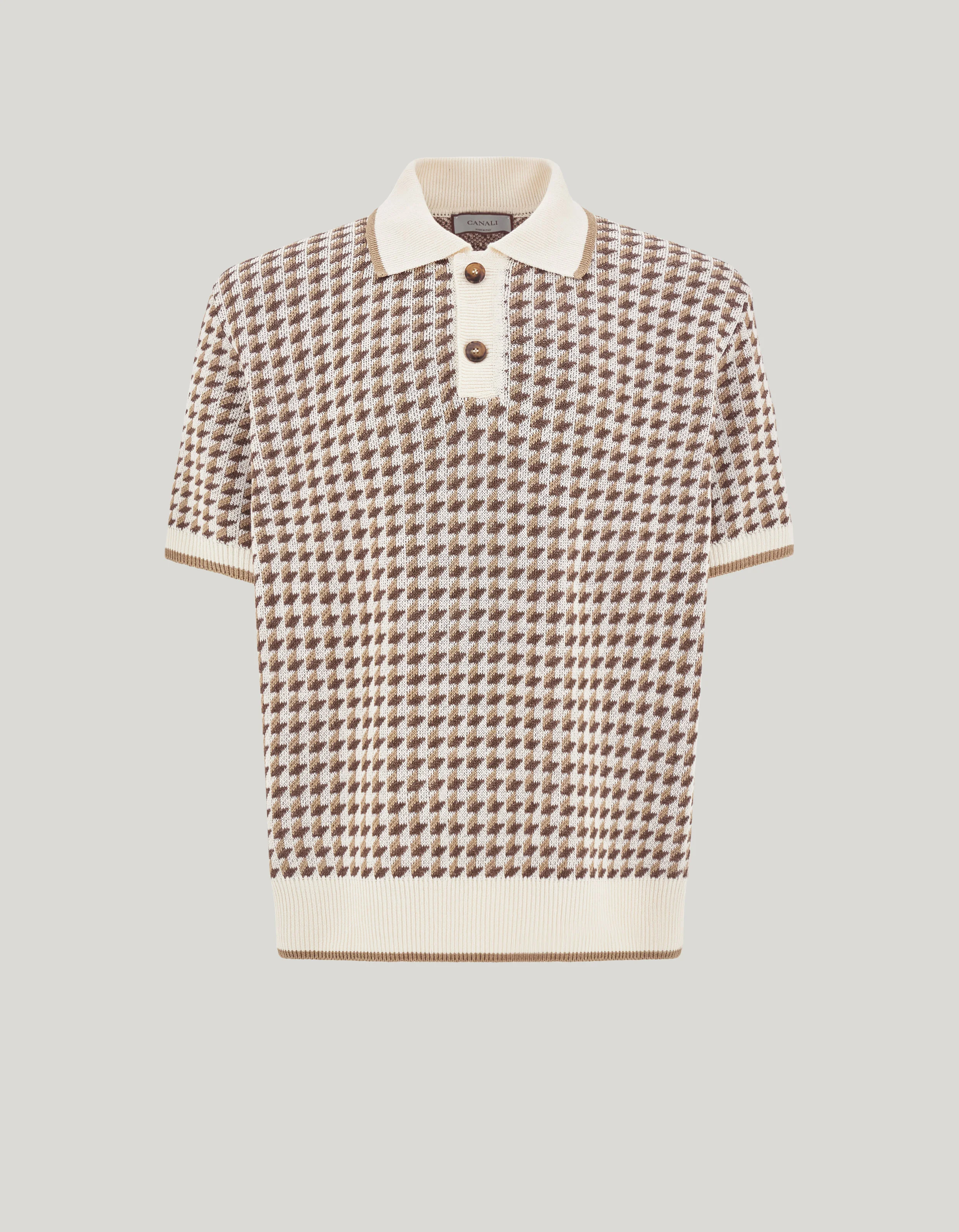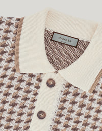 Short-sleeved polo shirt made of linen-silk blend with refined houndstooth jacquard pattern and contrasting details on the collar, sleeve edges, and bottom hem. The elegant texture and light touch of the fabric create a comfort and breathability that are ideal for the summer season. A distinctive garment perfect for enhancing the casual looks of the contemporary man. FABRICS AND CRAFTSMANSHIP - Short-sleeved buttoned polo shirt - Ribbed collar, hem, and sleeve edges - Finishes with contrasting details - Jacquard - 7 gauge - 70% Linen 30% Silk - Closed hem - Made in Italy CARE Hand wash max 40° Do not bleach Normal steam or dry iron on low (110°) Gentle dry clean with perchlorethylene Dry flat FIT The model is wearing a size 50 The model measures: Height: 185 cm Chest: 100 cm Waist: 79 cm Hips: 95 cm