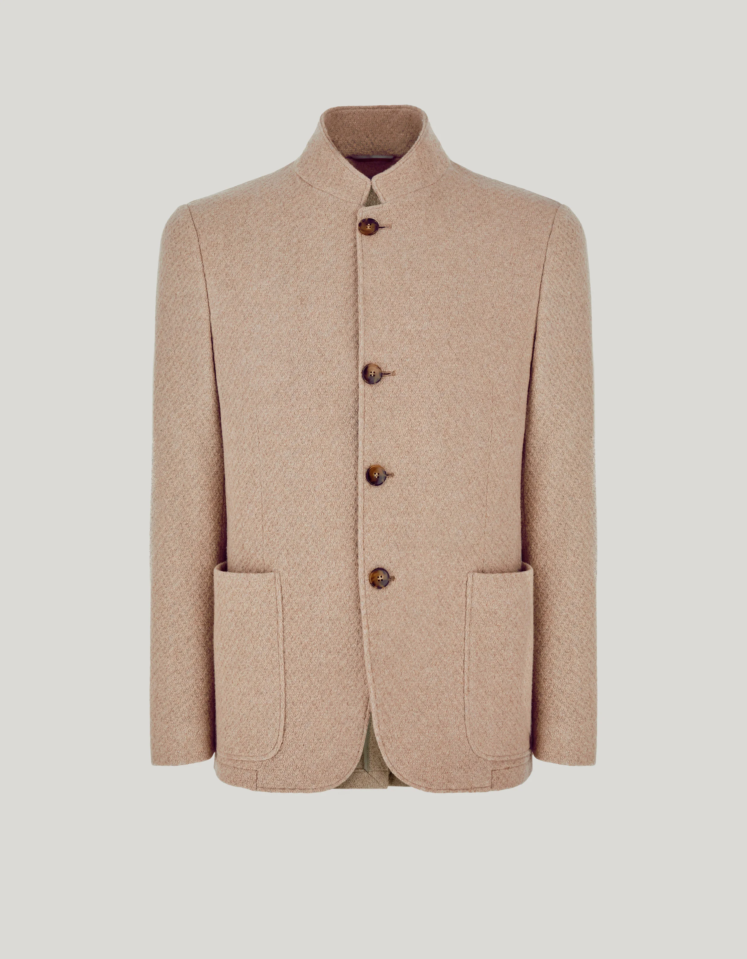Casual elegance and fine materials for this wool and cashmere jacket featuring a single-breasted design with four buttons and stand-up collar finished with suede bezels. The garment stands out for its precious composition that promises comfort and warmth, making it ideal for embellishing any outfit with a touch of style that won't go unnoticed. FABRICS AND CRAFTSMANSHIP Double-breasted four-button jacket Stand-up collar with suede bezel Patch pockets Sleeve bottoms with suede loop Jacket length 76 cm in size 50 56% wool 44% cashmere Made in Italy CARE Do not wash with water Do not bleach Normal steam or dry iron on low (110°) Dry clean with perchlorethylene Do not tumble dry FIT Jersey Jacket