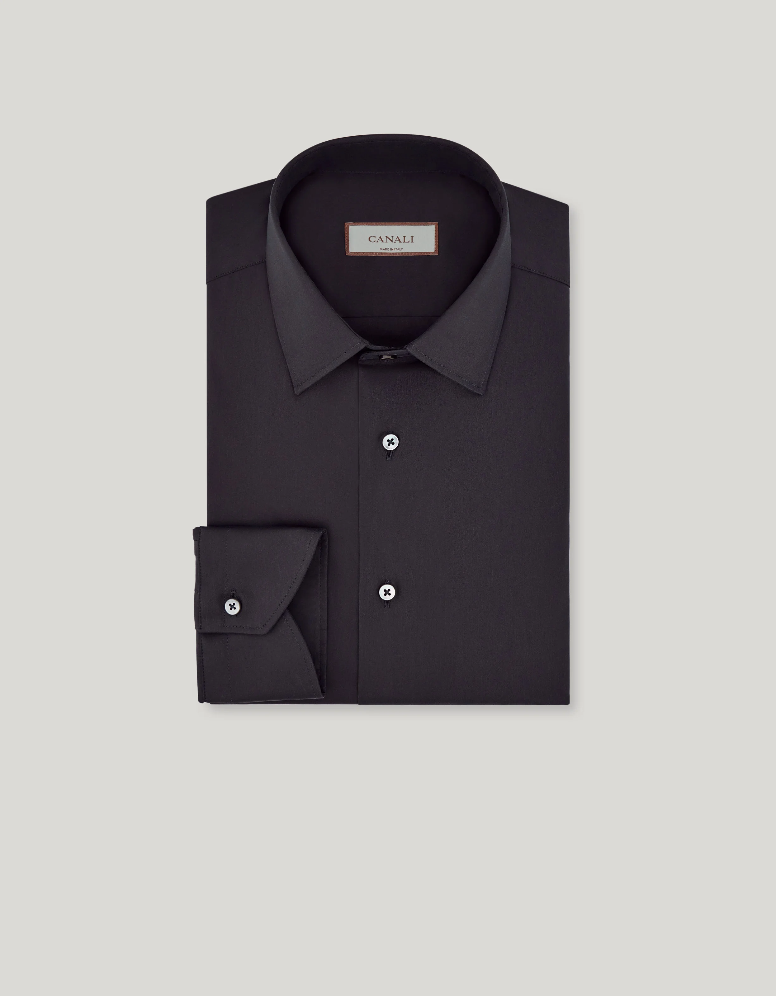 Regular fit shirt in stretch cotton with a contemporary cut and natural comfort. The collar adds a sophisticated touch, while the fit discreetly follows the lines of the body. A versatile piece, ideal for men who prefer a refined and casual style in any context. FABRICS AND CRAFTSMANSHIP - Formal shirt - Narrow pointed collar - Collar height 3.8 cm - Removable collar stiffeners - Smooth back without wrinkles - Plain front with no placket - Rounded cuff - 80% Cotton 18% Polyamide 2% Elastane - Made in Italy CARE Machine wash max 30° - delicate cycle Do not bleach Normal steam or dry iron on low (110°) Gentle dry clean with perchlorethylene Do not tumble dry FIT Regular fit The model is wearing a size 48 The model measures: Height: 192 cm (75.6 in) Chest: 93 cm (36.6 in) Waist: 67 cm (26.4 in) Hips: 88 cm (34.7 in)