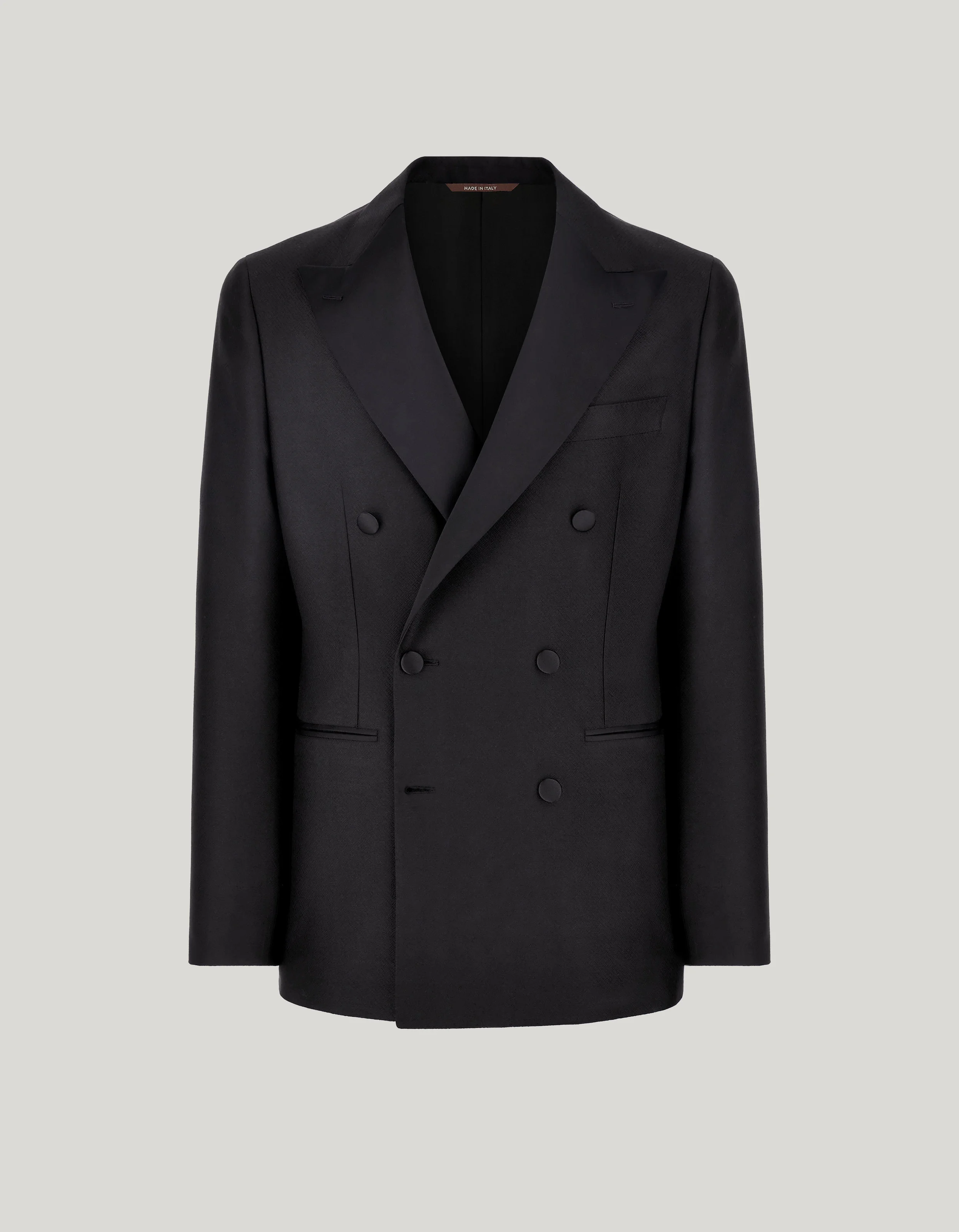 With timeless elegance, the black wool and silk tuxedo jacket is enhanced by a unique texture that lends a contemporary touch. The double-breasted, six-button design and fine details, such as the welt pockets and satin peak lapel, enhance the sophisticated design and Italian craftsmanship. A precious garment capable of winning over even the most demanding man. FABRICS AND CRAFTSMANSHIP Double-breasted six-button tuxedo jacket Satin peak lapels Silk welt pockets and slit breast pocket Jacket length 74 cm in size 50 70% wool 30% silk Made in Italy CARE Do not wash with water Do not bleach Normal steam or dry iron on low (110°) Gentle dry clean with hydrocarbon solvents Do not tumble dry FIT Modern fit In the Capri model, the jacket is slightly shorter and more fitted around the hips and chest. Its lightweight design features tailored shirt sleeves and 0.5 cm padded shoulders. These pleatless pants are low-waisted, and have quite a slim fit on the thigh and a narrow pleat at the hem. The model is wearing a size 50 The model measures: Height: 185 cm (72.8 in) Chest: 100 cm (39.4 in) Waist: 79 cm (31.1 in) Hips: 95 cm (37.4 in)