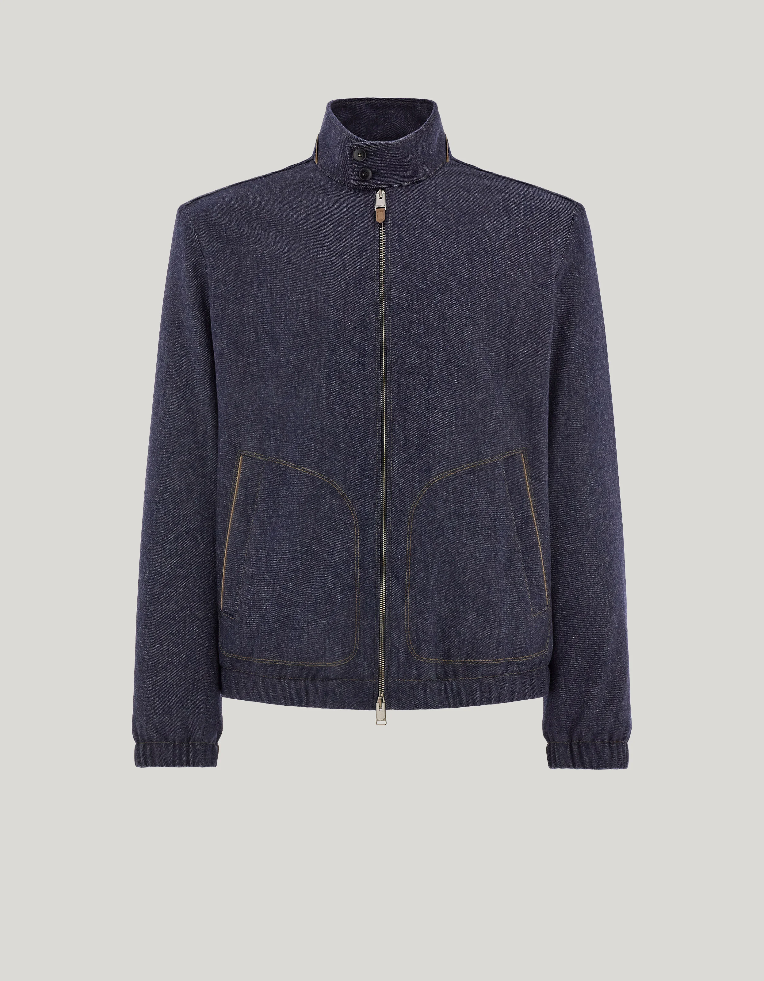 Blouson jacket in 150's wool with a denim effect, featuring nubuck details and contrast stitching, designed for the man seeking comfort and timeless style. Perfect for adding modernity and relaxed elegance to any day in the city. FABRICS AND CRAFTSMANSHIP - Blouson jacket with stand-up collar and raglan sleeves - Double-slider zippered closure with nubuck pull tab - Slanted side pockets - Elasticized cuffs and hem - Nubuck details - Logoed nubuck tag with hand-painted edges - Unlined piece - Patch pocket - 100% 150’s Wool - Made in Italy CARE Do not wash with water Do not bleach Do not iron Gentle dry clean with perchlorethylene Do not tumble dry FIT The model is wearing a size 48 The model measures: Height: 189 cm (74.4 in) Chest: 98 cm (38.6 in) Waist: 82 cm (32.3 in) Hips: 97 cm (38.2 in)