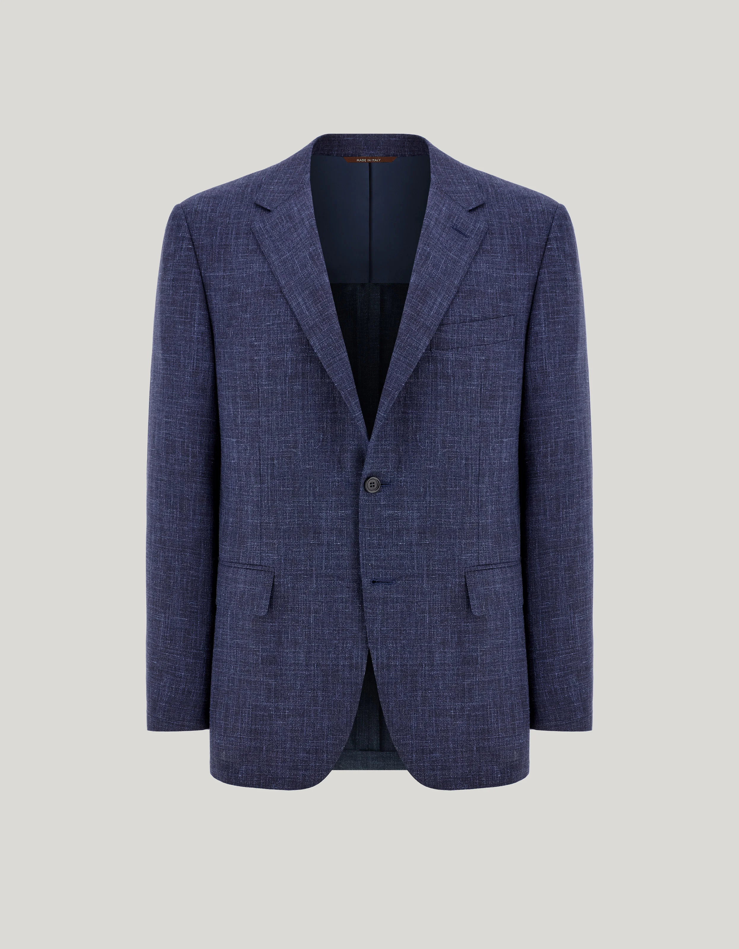 Unlined single-breasted jacket in a refined blend of wool, silk and linen has a regular fit that naturally enhances the body's lines. The lightweight and breathable fabric ensures comfort and freedom of movement, while the flap pockets add a functional and balanced touch. An ideal garment for the dynamic man who interprets elegance with ease in any context. FABRICS AND CRAFTSMANSHIP - Unlined single-breasted two-button jacket - Welted pockets with flap and slit breast pocket - Jacket length 75 cm in size 50 - 71% Wool 15% Silk 14% Linen - Made in Italy CARE Do not wash with water Do not bleach Normal steam or dry iron on low (150°) Dry clean with perchlorethylene Do not tumble dry FIT Regular fit In the Contemporary model, the length of the jacket is regular, with broad shoulders but with a thin shoulder pad, and regular lapels. The model is wearing a size 50 The model measures: Height: 185 cm (72.8 in) Chest: 100 cm (39.4 in) Waist: 79 cm (31.1 in) Hips: 95 cm (37.4 in)