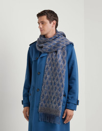 A boucle scarf with a wrap-around texture, embellished with a refined lozenge pattern that lends timeless elegance. The generous length ensures versatility and style, designed for the man who wants to complete his winter look with a distinctive touch. FABRICS AND CRAFTSMANSHIP - Scarf - Logoed leather tag - Size 45 x 180 cm - 85% wool 11% mohair 4% polyamide - Made in Italy CARE Do not wash with water Do not bleach Do not iron Dry clean with perchlorethylene Do not tumble dry