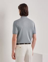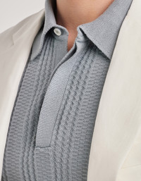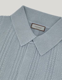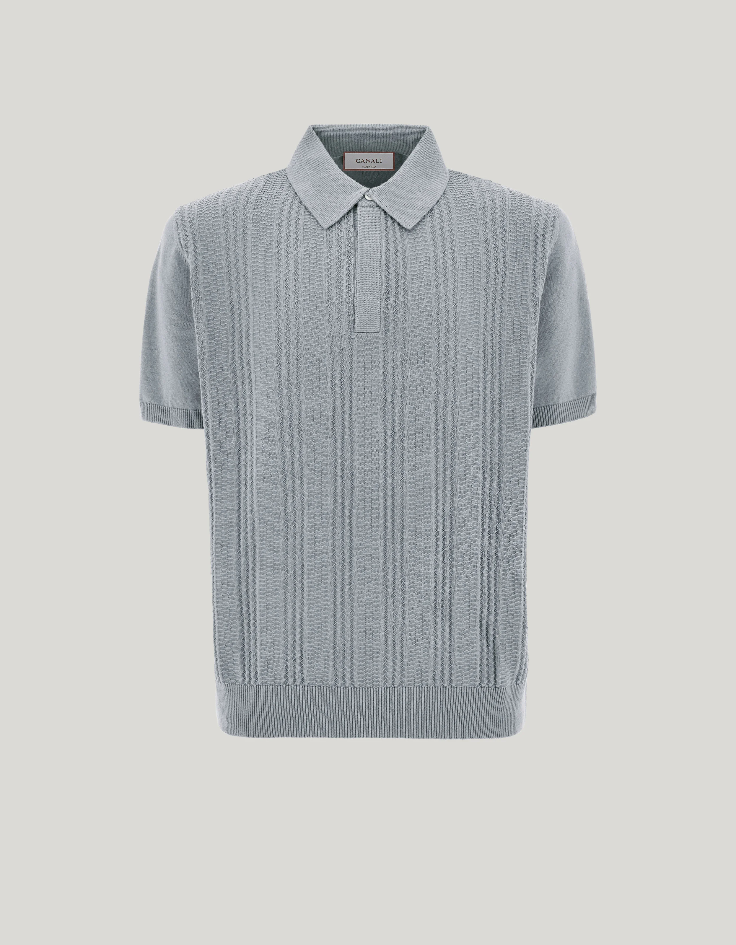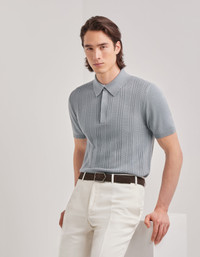 Short-sleeved polo shirt made with a soft cotton blend, enhanced by a refined vertical workmanship that gives the garment three-dimensionality and character. The classic collar with concealed placket and ribbed trims on the collar, hem and sleeve edges complete an essential and refined design. A shirt that combines comfort and sobriety for a contemporary and relaxed elegance. FABRICS AND CRAFTSMANSHIP - Short-sleeved buttoned concealed placket polo shirt - Ribbed collar, hem, and sleeve edges - Microstructure - 12 gauge - 50% Cotton 50% Modal - Closed hem - Made in Italy CARE Hand wash max 40° Do not bleach Normal steam or dry iron on low (110°) Gentle dry clean with perchlorethylene Dry flat FIT The model is wearing a size 50 The model measures: Height: 185 cm (72.8 in) Chest: 100 cm (39.4 in) Waist: 79 cm (31.1 in) Hips: 95 cm (37.4 in)