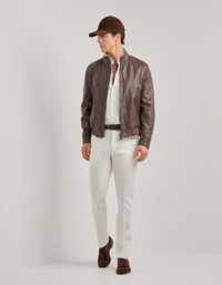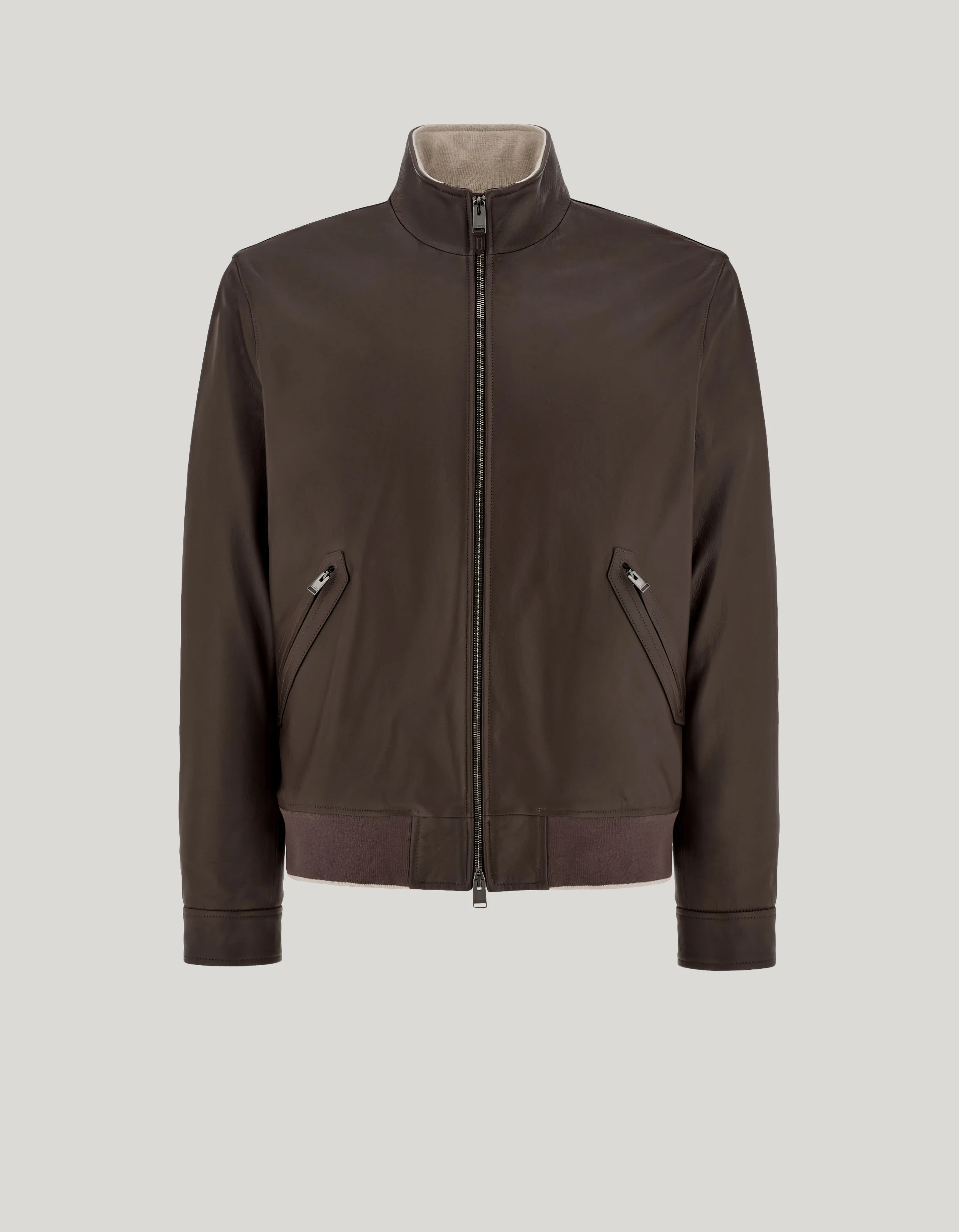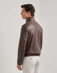 Lambskin nappa leather blouson with a soft touch, defined by stand-up collar and knitted inserts on the inner collar and bottom hem. The double-slider zipper and snap cuffs ensure functionality and comfort, while the clean, contemporary design reflects casual elegance. A versatile garment designed for the man who seeks style and everyday practicality. FABRICS AND CRAFTSMANSHIP - Stand-up collar blouson jacket with set-in sleeves - Double-slider zippered closure with leather pull tab - Zippered hand pockets - Cuffs with snap button - Knit details: inner collar and bottom hem - Dark ruthenium logoed snaps - Lined garment - Zippered internal pocket - 100% Lambskin - Made in Italy CARE Do not wash with water Do not bleach Do not iron Do not dry clean Do not tumble dry FIT The model is wearing a size 50 The model measures: Height: 185 cm (72.8 in) Chest: 100 cm (39.4 in) Waist: 79 cm (31.1 in) Hips: 95 cm (37.4 in)