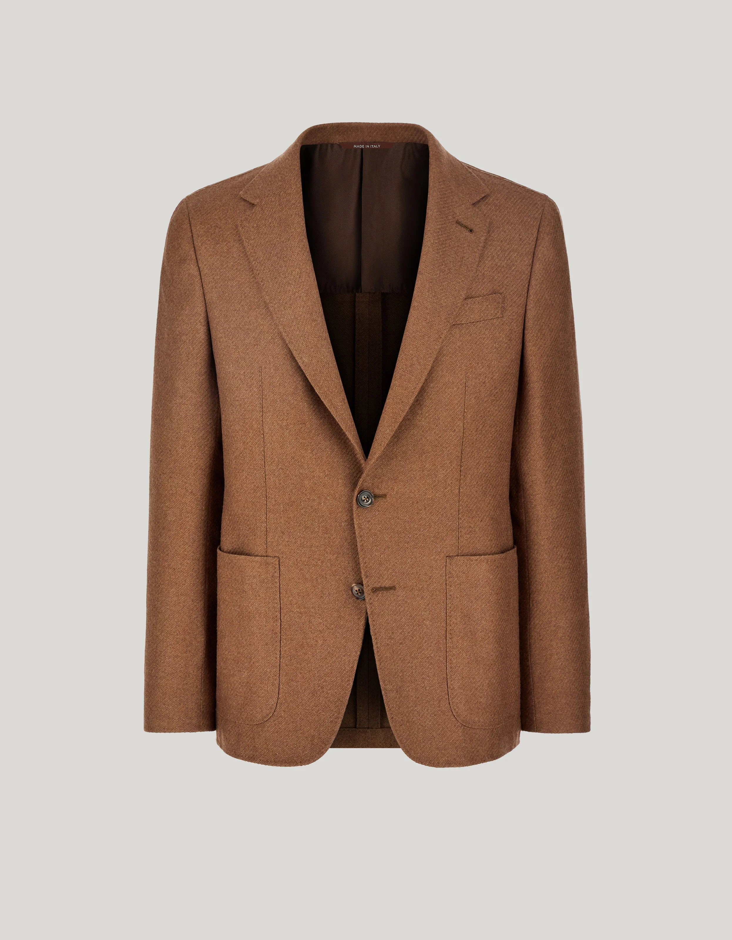 Unlined Kei jacket in cashmere-silk grisaille with deconstructed workmanship. The lightness of the shirtsleeves and natural shoulders blends with a modern-drop 7 fit that enhances the silhouette. Tailored finishes express the excellent craftsmanship of a garment designed for the man who seeks a distinctive style, combining comfort, elegance and attention to detail. FABRICS AND CRAFTSMANSHIP - Unlined single-breasted two-button jacket - Patch pockets and slit breast pocket - Sleeves with shirt lapels - Inside pockets with fabric trim and small triangle lining -The garment is deliberately without buttons and buttonholes at the bottom of the sleeve to allow the customer to customize the length of the sleeve - Jacket length 75 cm in size 50 - 53% cashmere 47% silk -Made in Italy CARE Do not wash with water Do not bleach Normal steam or dry iron on low (150°) Dry clean with perchlorethylene Do not tumble dry FIT Modern Fit - Drop 7 The jacket is soft and unstructured, with a contemporary fit on the shoulders, chest and hips. The waist is more fitted, creating a slimmer silhouette. Set-in shirt sleeves and an ultra-light 1 mm shoulder pad. The model is wearing a size 50 The model measures: Height: 185 cm (72.8 in) Chest: 100 cm (39.4 in) Waist: 79 cm (31.1 in) Hips: 95 cm (37.4 in)