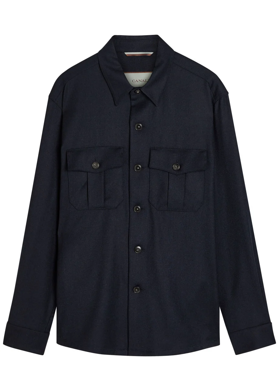 Info & Care Canali wool overshirt Button-fastening cuffs, button-fastening chest flap pockets with box pleat, side slip pockets, logo embroidery at back, two internal patch pockets Button fastenings through front 100% wool; lining: 63% viscose, 37% polyester Dry clean Size & Fit Length shoulder to hem: 28 inches/ 71cm Midweight Regular fit Model is 6'1"/ 185cm, chest size 36 inches and wears a size;IT48