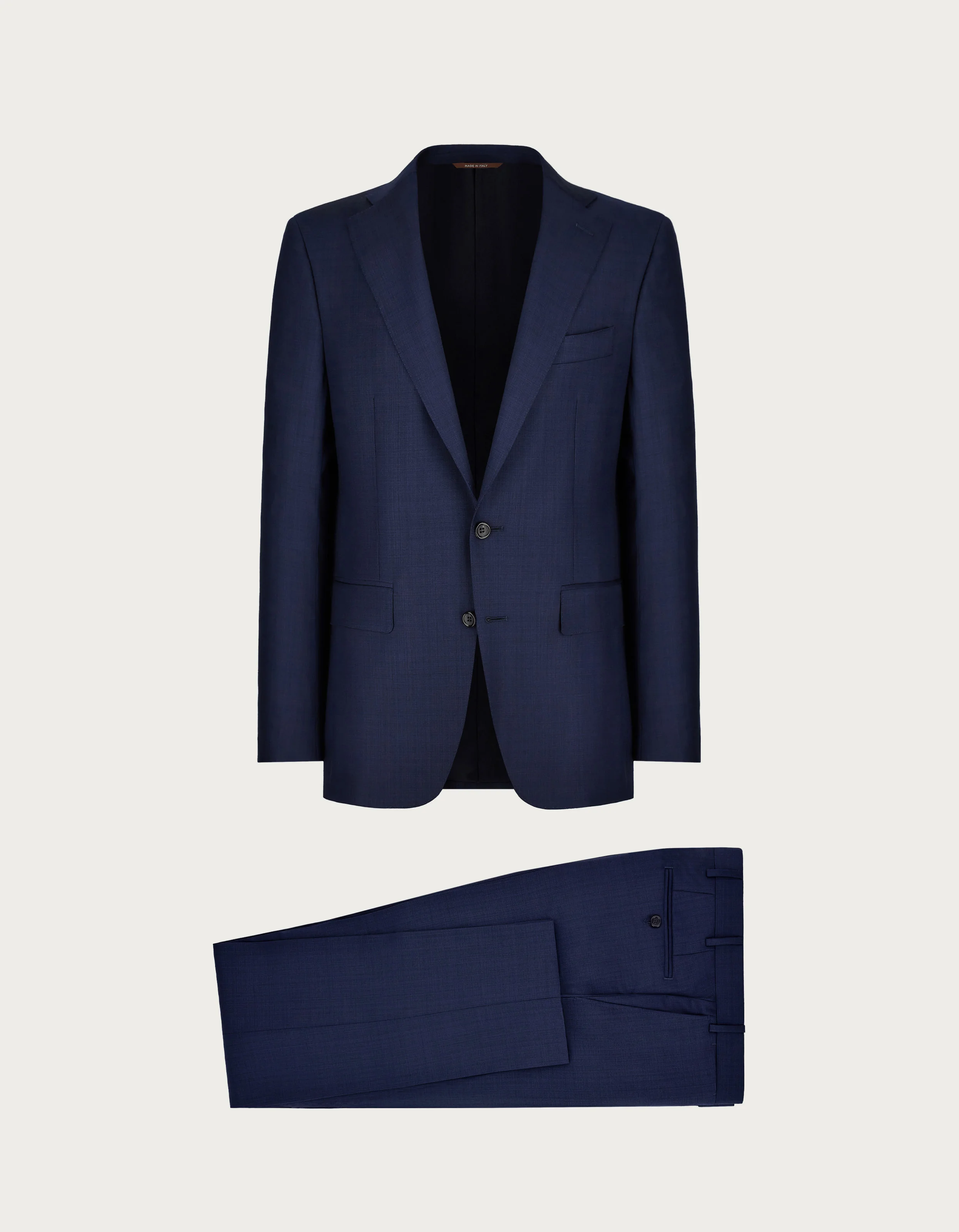 A pure wool yarn gives life to this sophisticated dual-tone dress with an irregular pattern, constructed with the contemporary comfort of a modern fit. Consisting of a single-breasted jacket and pants without pleats, it gracefully enhances the formal autumn-winter looks of today's man. FABRICS AND CRAFTSMANSHIP - Single-breasted two-button jacket - Slash pockets with flaps and a slash breast pocket - Blazer length: 74 cm in size 50 - Pants without pleats - Slanted pockets and two rear welt pockets - Cuff 19 cm - 100% wool - Made in Italy CARE Do not wash with water Do not bleach Normal steam or dry iron on low (150°) Dry clean with perchlorethylene Do not tumble dry FIT Modern fit The Capri jacket is slightly shorter and more fitted around the hips and chest. Its lightweight design features tailored shirt sleeves and 0.5 cm padded shoulders. The low-waisted flat front pants are slightly fitted around the thighs with narrow cuffs. The model is wearing a size 48 The model measures: Height: 188 cm Chest: 94 cm Waist: 75 cm Hips: 93 cm