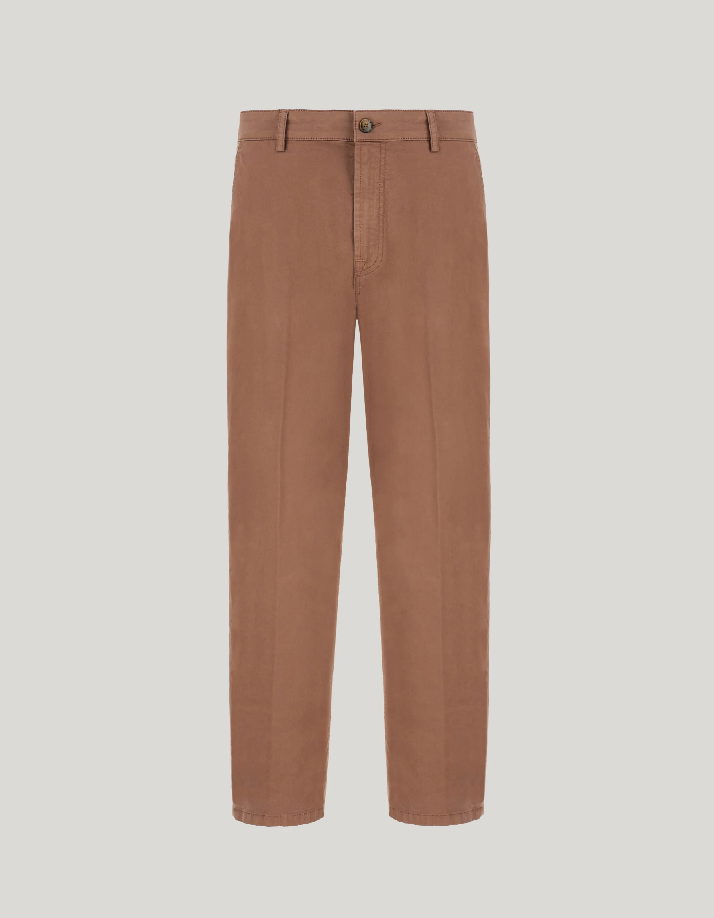 Flat-front chinos in garment-dyed cotton microtwill, featuring a design embodied by the button fastening and double welt pockets with button. A distinctive appeal, characterised by the unique carrot fit and original colour scheme, completes this garment designed to stylishly dress the modern businessman for any smart-casual occasion. FABRICS AND CRAFTSMANSHIP - Flat-front chinos - Carrot fit - Central fastening with visible button - Rear double welt pockets with visible buttons - Cuff 19 cm - Comfort garment-dyed microtwill - 98% cotton, 2% elastane - Made in Italy CARE Machine wash max 30° - delicate cycle Do not bleach Normal steam or dry iron on low (110°) Gentle dry clean with perchlorethylene Do not tumble dry FIT Carrot Fit The model is wearing a size 48 The model measures: Height: 190 cm Chest: 92 cm Waist: 75 cm Hips: 92 cm