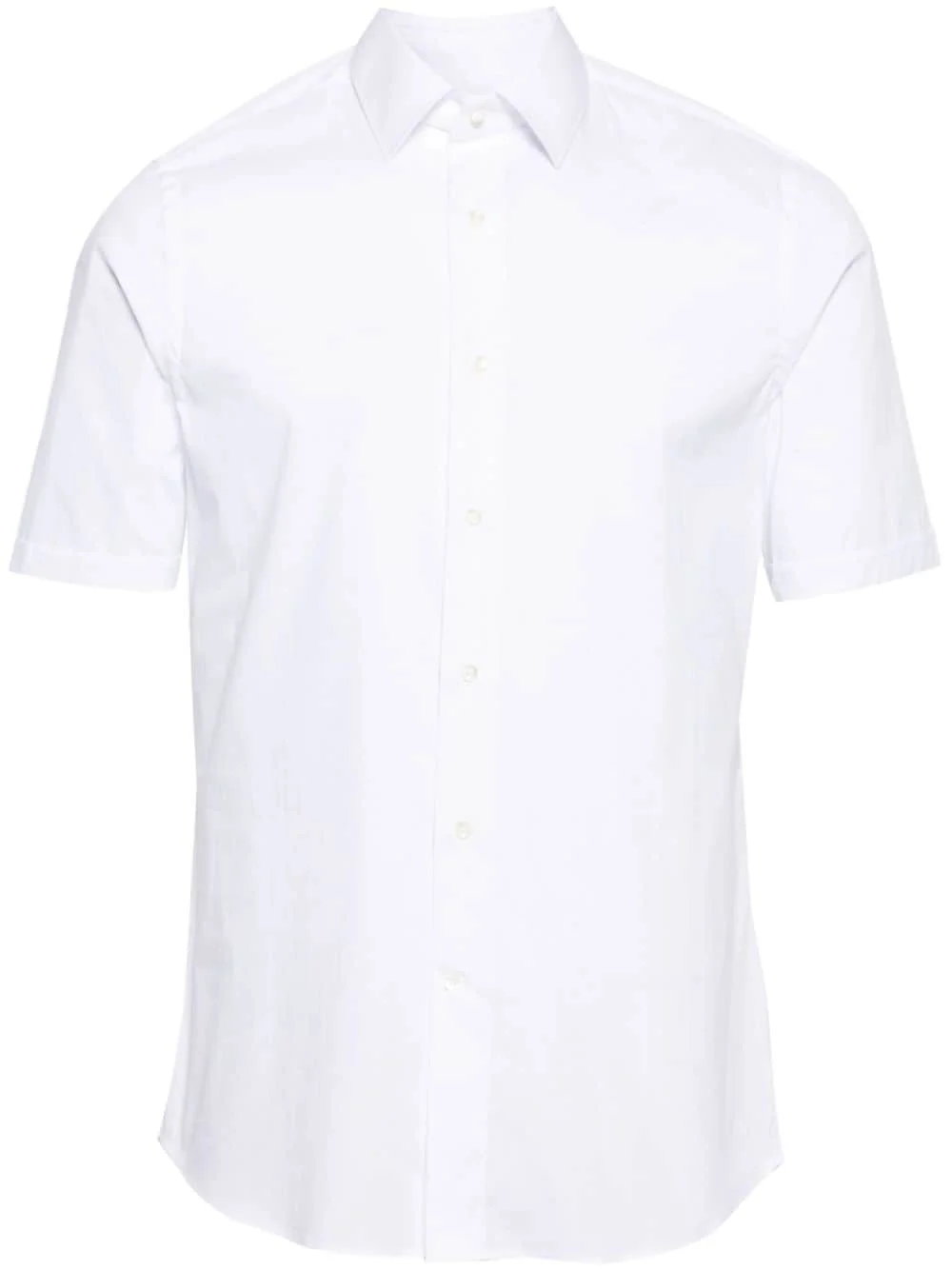 classic-collar short-sleeve shirt Highlights - White - Cotton blend - Poplin texture - Dart detailing - Classic collar - Front button fastening - Short sleeves - Curved hem Made in Italy Composition Cotton 79%, Polyamide 17%, Elastane 4% SIZE & FIT Model measurements Height 6 ft 2 in(1.87 m) Bust/Chest 36.41 in(92.5 cm) Hips 37 in(94 cm) Waist 29.52 in(75 cm) FittingInformation Designed for a slim fit, offering a comfortable fit that sits just away from the body The dart stitching adds structure and a closer fit in the torso of this piece Made from a midweight stretch fabric, this piece offers elasticity and flexibility when worn This piece fits true to size – take your usual size