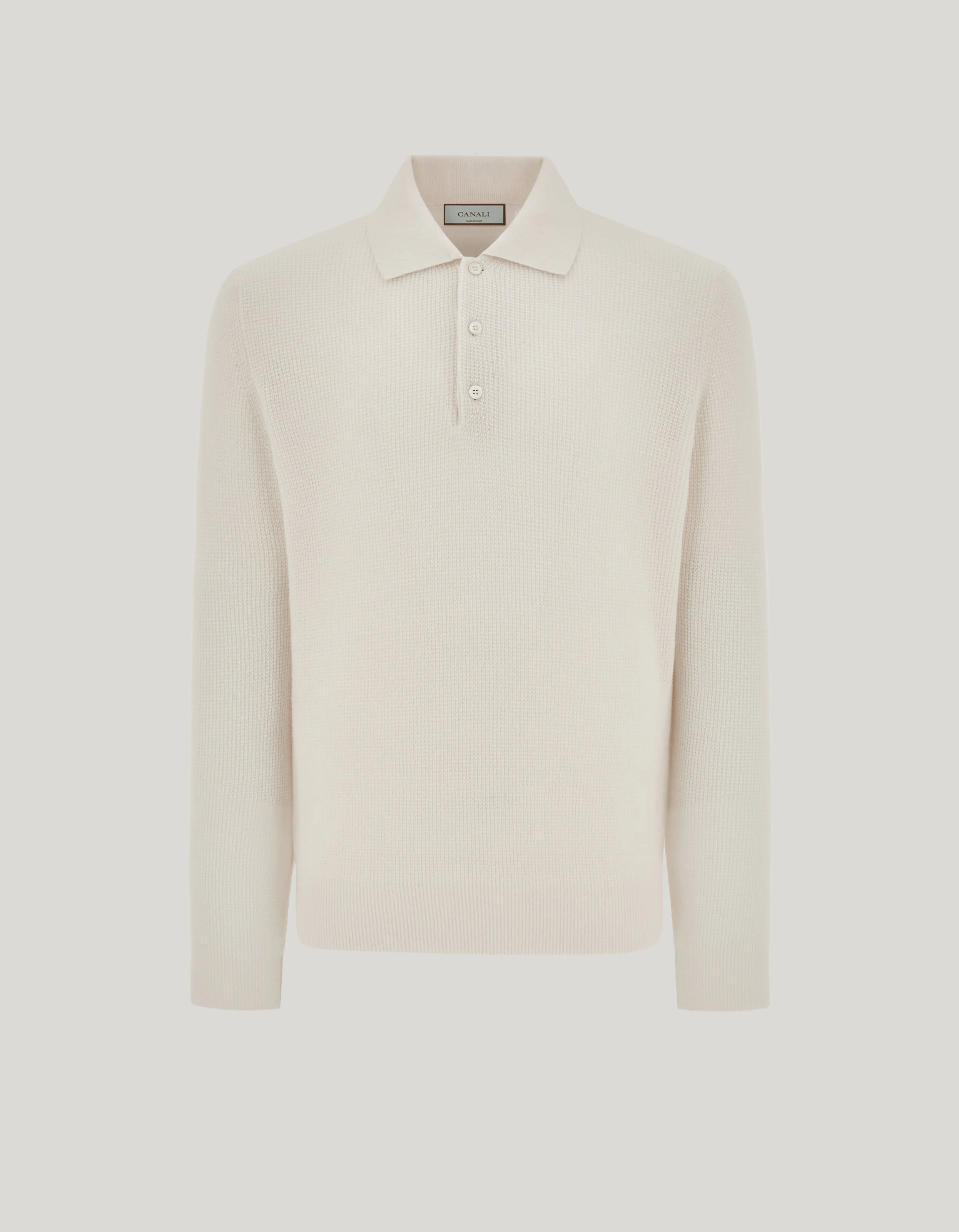 Wool-cashmere long sleeved polo shirt, an emblem of refined versatility and everyday comfort. The micro-structured design enhances the silhouette with sobriety, while the beige leather button list adds a distinctive and sophisticated detail. A dynamic and sophisticated piece, ideal for interpreting every moment of the day with natural elegance. FABRICS AND CRAFTSMANSHIP - Long sleeved button-down polo shirt - Sail collar, ribbed hem and sleeve edges - Structured - 12 gauge - 90% wool 10% cashmere - 100% lambskin (intervention) - Made in Italy CARE Do not wash with water Do not bleach Normal steam or dry iron on low (110°) Gentle dry clean with perchlorethylene Do not tumble dry FIT The model is wearing a size 48 The model measures: Height: 186 cm (73.2 in) Chest: 81 cm (31.9 in) Waist: 70 cm (27.6 in) Hips: 82 cm (32.3 in)