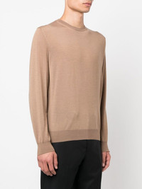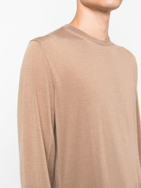 crew-neck jumper camel brown wool-cashmere-silk blend fine knit crew neck long sleeves straight hem Made in Italy Composition Cashmere 35%, Wool 35%, Silk 30% SIZE & FIT Model measurements Height 6 ft 1 in(1.85 m) Bust/Chest 35.82 in(91 cm) Hips 37.79 in(96 cm) Waist 29.13 in(74 cm) FittingInformation This piece fits true to size. We recommend you get your regular size Cut for a relaxed fit Made with a mid-weight fabric Washing instructions Hand Wash