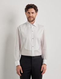 Our white cotton dress shirt is a stunning choice for your formal engagements. Realized in a pure cotton material, the garment has a pleated bib and Italian collar. Black stud buttons serve as a distinguished detail, marking the wearer as a man of great taste. FABRICS AND CRAFTSMANSHIP - Long sleeve formal shirt - Classic Italian collar with cufflink button - Pleated bib with stud buttons - Smooth back - Double cuffs - Soft internal collar insert CARE Machine wash max 30° - delicate cycle Do not bleach Normal steam or dry iron on low (110°) Gentle dry clean with perchlorethylene Do not tumble dry FIT Regular Fit The model is wearing a size 48 The model measures: Height: 188cm Chest: 95cm Waist: 79cm Hips: 94cm