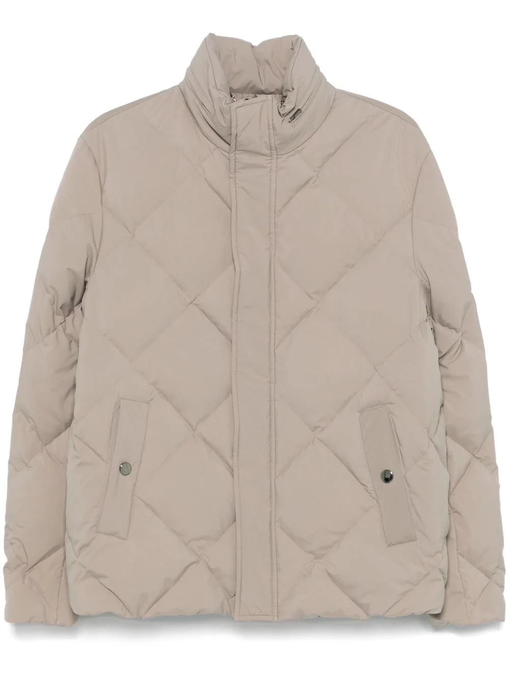 diamond-quilted jacket Highlights - Beige - Front press-stud and zip fastening - Concealed hood - Two side stud-fastening pockets - Full lining Made in Italy Composition Outer: Polyester 100% Lining: Polyurethane 100%, Polyester 100%, Cotton 100%, Goose Down 90%, Duck Feathers 10% SIZE & FIT Model measurements Height 6 ft 2 in(1.89 m) Bust/Chest 35.03 in(89 cm) Hips 38.18 in(97 cm) Waist 29.92 in(76 cm) FittingInformation Designed for a regular fit, allowing for a comfortably loose fit throughout the body Made from a padded non-stretch fabric, giving it no natural elasticity