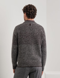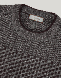 Wool and alpaca crewneck sweater with jacquard boucle work. The patchwork structure and contrasting patterns enhance the materiality of the fabric, while the raglan sleeves ensure comfort and freedom of movement. The structured arrow on the back and vanise rib trim add character to a garment with a strong visual identity, designed for the man who wants to enrich his winter wardrobe with distinctive style and highly crafted details. FABRICS AND CRAFTSMANSHIP - Long sleeve crewneck - Ribbed vanise neckline, hem and cuffs - Jacquard - Processed in gauge 5 - 80% cotton 15% alpaca 5% polyamide - Made in Italy CARE Hand wash max 40° Do not bleach Normal steam or dry iron on low (110°) Gentle dry clean with perchlorethylene Dry flat FIT The model is wearing a size 50 The model measures: Height: 185 cm (72.8 in) Chest: 100 cm (39.4 in) Waist: 79 cm (31.1 in) Hips: 95 cm (37.4 in)